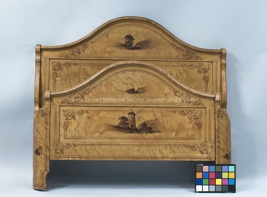 From MOHAI Catalog Card: Pine hand painted bedstead. Brought around the Horn in the early 1850s by Captain Coupe founder of Coupeville, Whidbey Island. Pumpkin pine - so called for its golden color. Bed is about 3/4 size. All surface painted in wavy lines with small pastoral scene on headboard. Footboard curved at ends and also painted with scenes.Lexicon