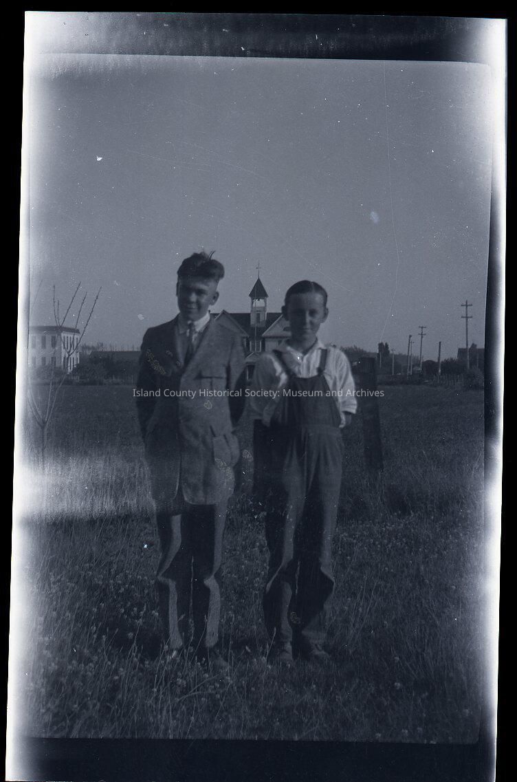 Negative of two older boys standing outside. The one on the left is wearing overalls, the one on the right, a suit. Probably a school is in the background between them. It has a bell at the top.