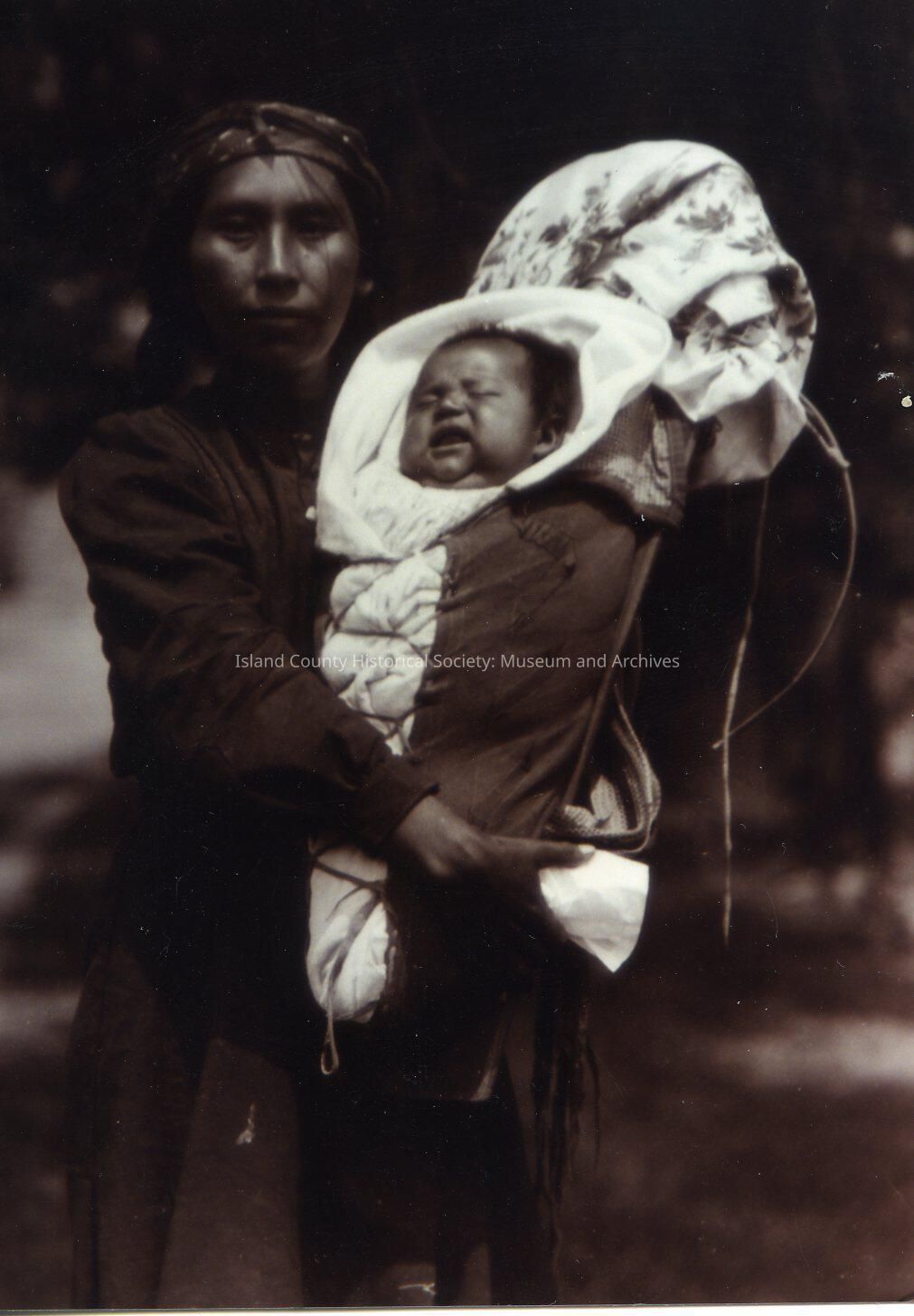 Indigenous Peoples of the Northwest Coast Lummi woman holding a baby which is on a cradleboard.