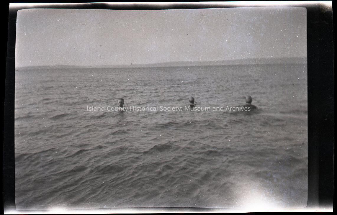 Negative of three, probably young people, swimming off a coast. These photos are from a Newberry folder. They were in an sleeve marked Newberry.