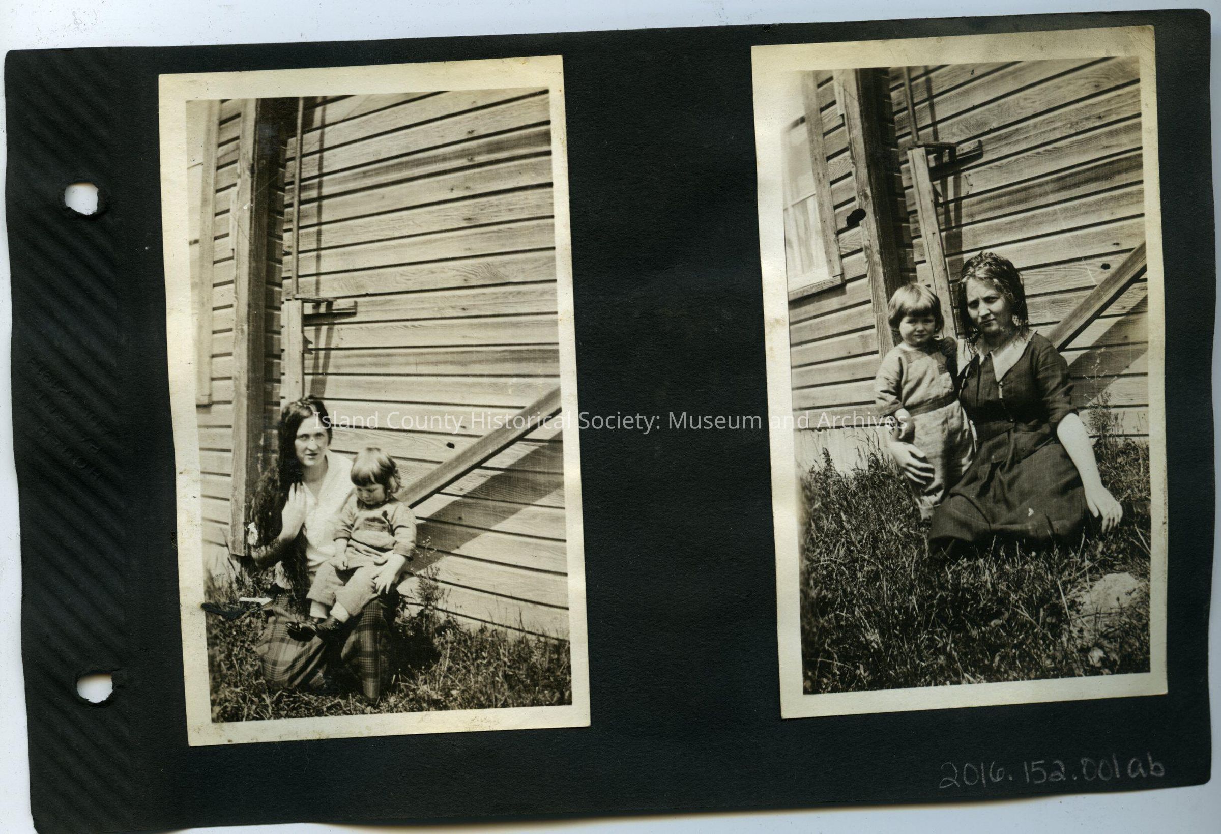 Right: A young woman holding a girl on her knee while sitting in front of a building, pipe behind them. 2.75"W x 4.5"H