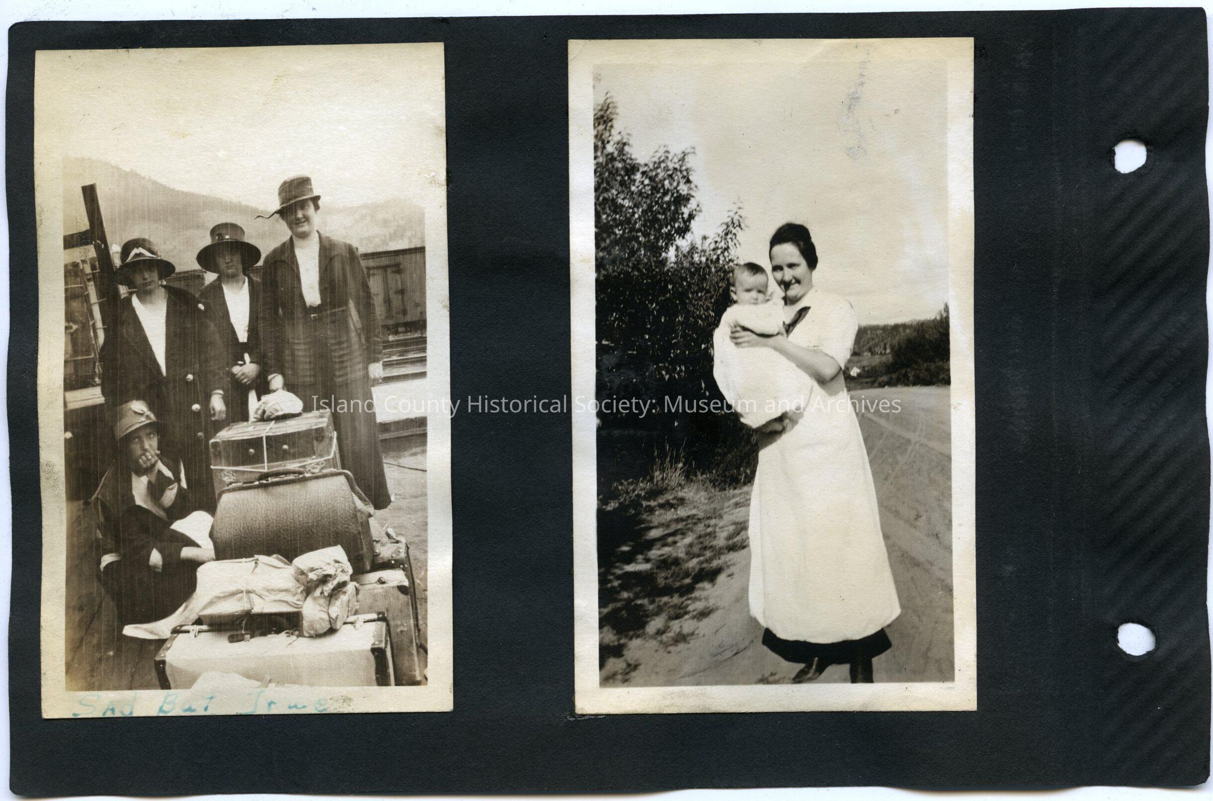 Left: A group of four women, one kneeling. All in coats and hats. Pile of baggage in front of them at probably a train station. Caption: Sad but true. 2.75"W x 4.5"H