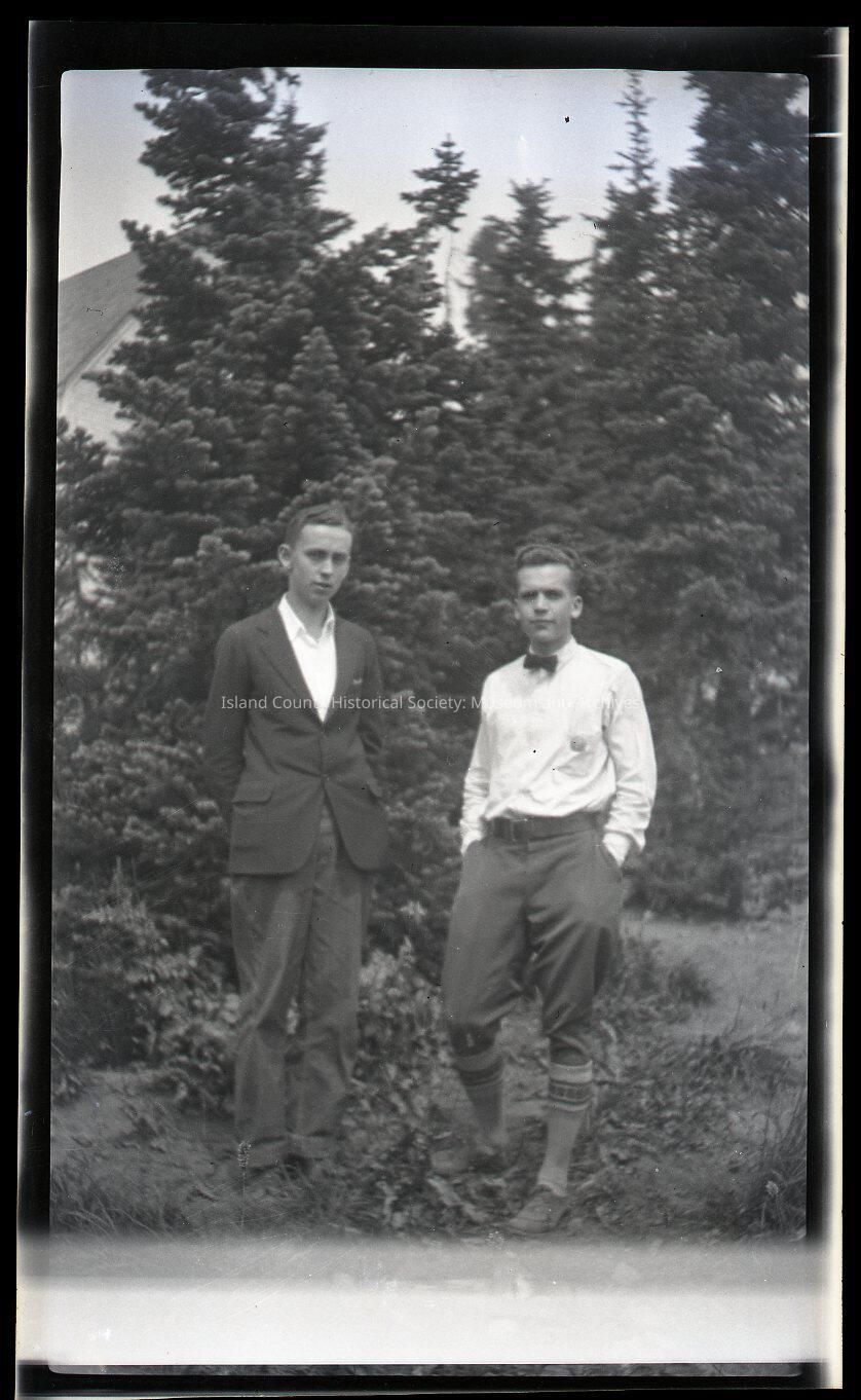Negative of two young men standing outside in front of some trees. The one on the left is wearing a suit and no tie. The one on the right, shirt, bow tie, knickers and knee-high socks. A large building is just visible behind the trees.
