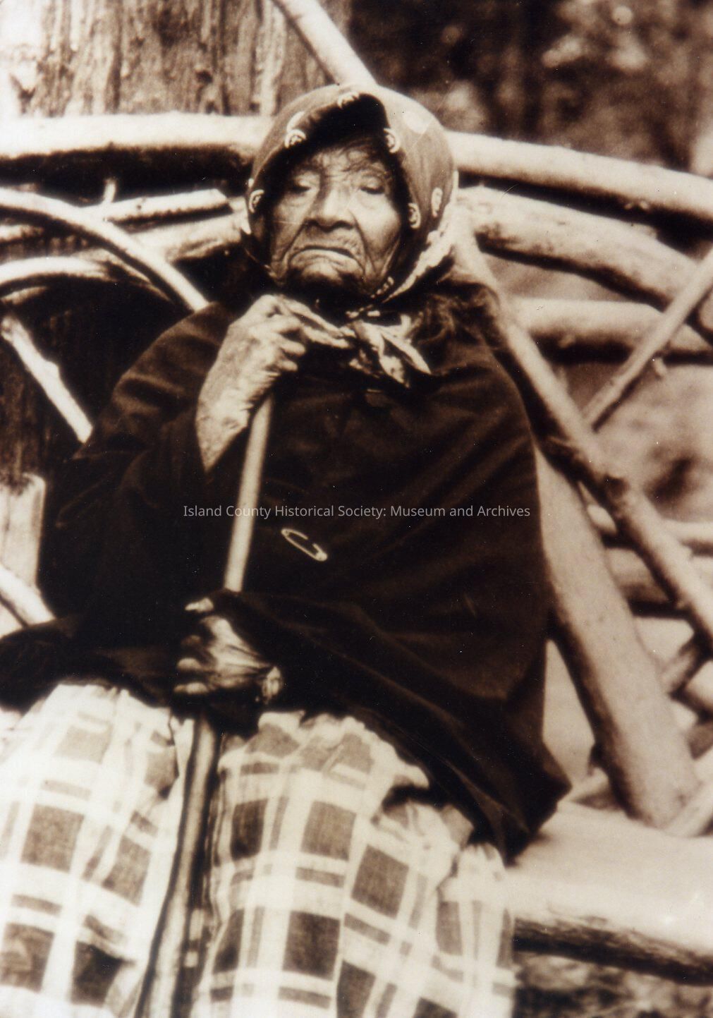 Indigenous Peoples of the Northwest Coast The photo is of an elderly native woman seated with a walking cane under her chin