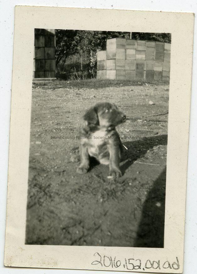 Small photo of a dog or large puppy looking to the left while seated. In the background are large boxes or concrete block.