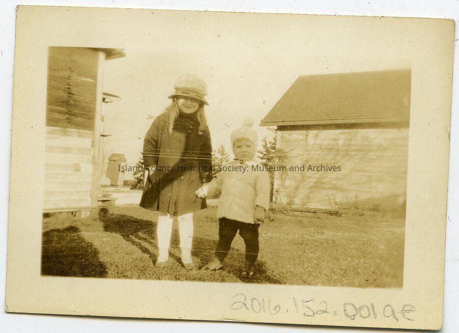 Small photo of two little girls - larger one in skirt and hat with scarf holding the smaller by the right hand. She is wearing a coat, hat and pants. Buildings beside and behind them.