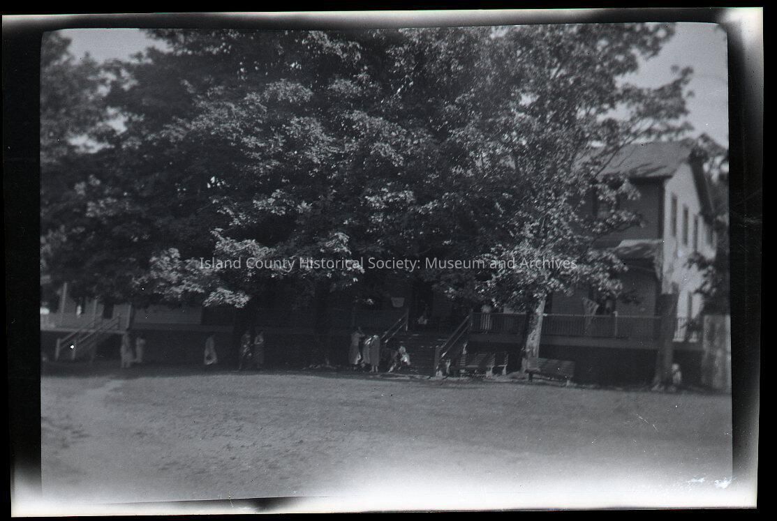 Negative of a long two-story building behind trees and bushes. People are on the path in front.