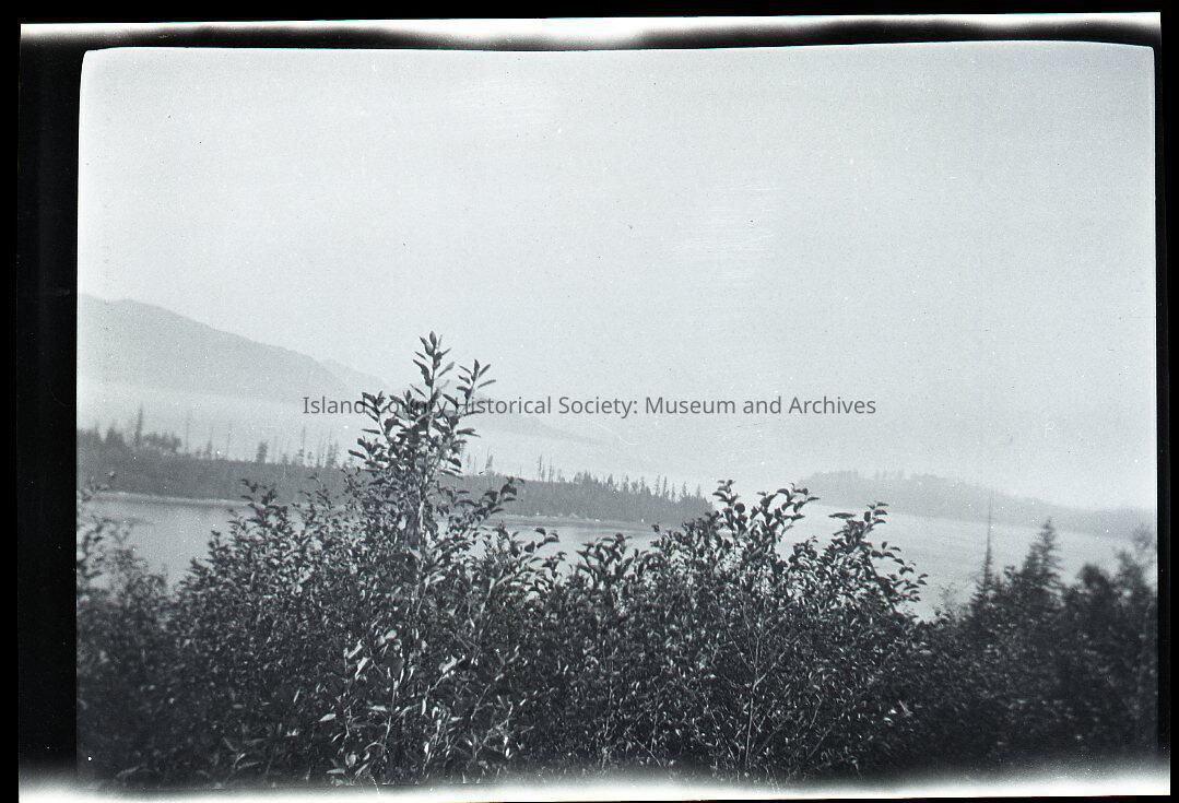 Negative of a hill or low mountain, trees in the fore and middle ground. Water in betwen. Probably fog.
