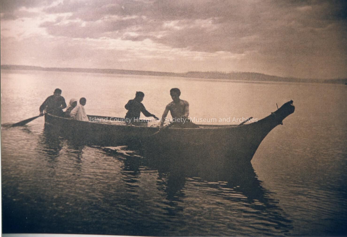 Indigenous Peoples of the Northwest Coast Group of five in a canoe, adults are rowing.