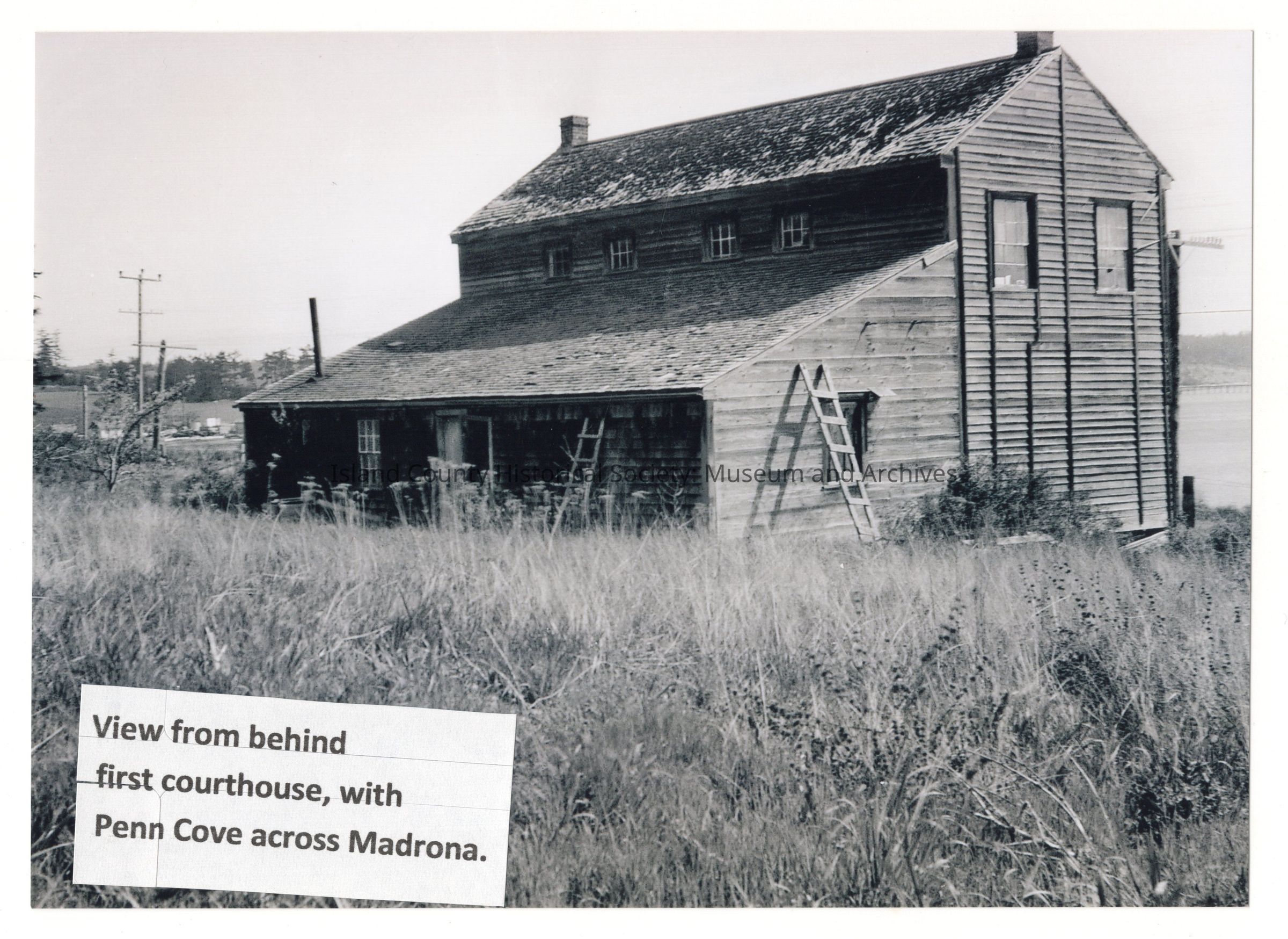 View from behind first courthouse, with Penn Cove across Madrona Way