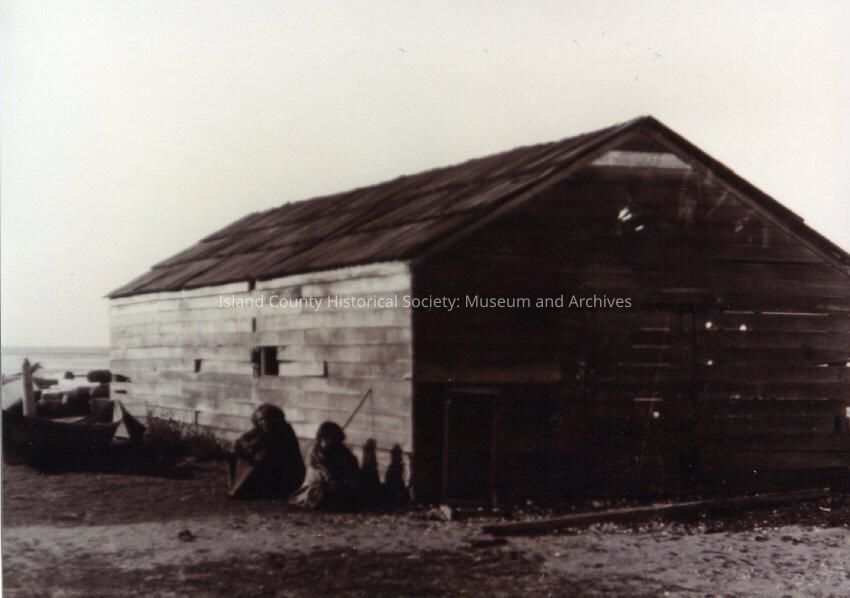 Indigenous Peoples of the Northwest Coast Large wood barn with two people wrapped in blankets outside.