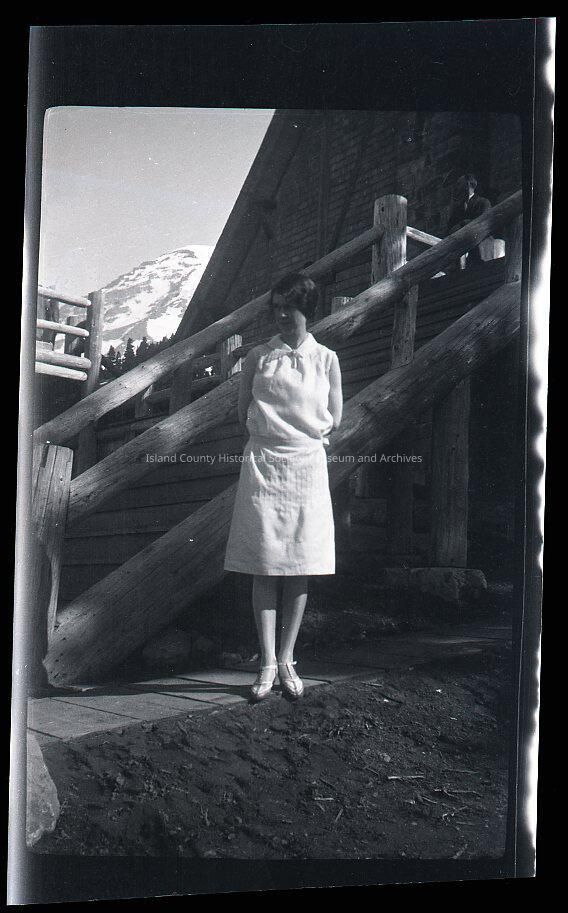 Negative of a woman standing in front of long wooden stairs; a man is seated at the top. Her dress is knee-length, she is wearing stockings and shoes. He is wearing a suit.