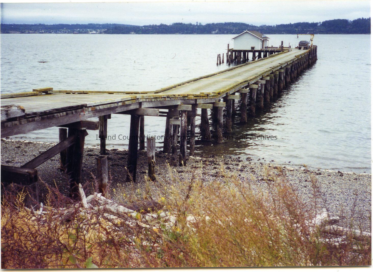 Photo of the wharf on the San de Fuca side of Penn Cove that is used by the Penn Cove Mussel company. The photo was clipped to some letters about Fidelia Newberry Power which are in the Pioneer Family box in a folder marked Power, Fidelia Newberry.