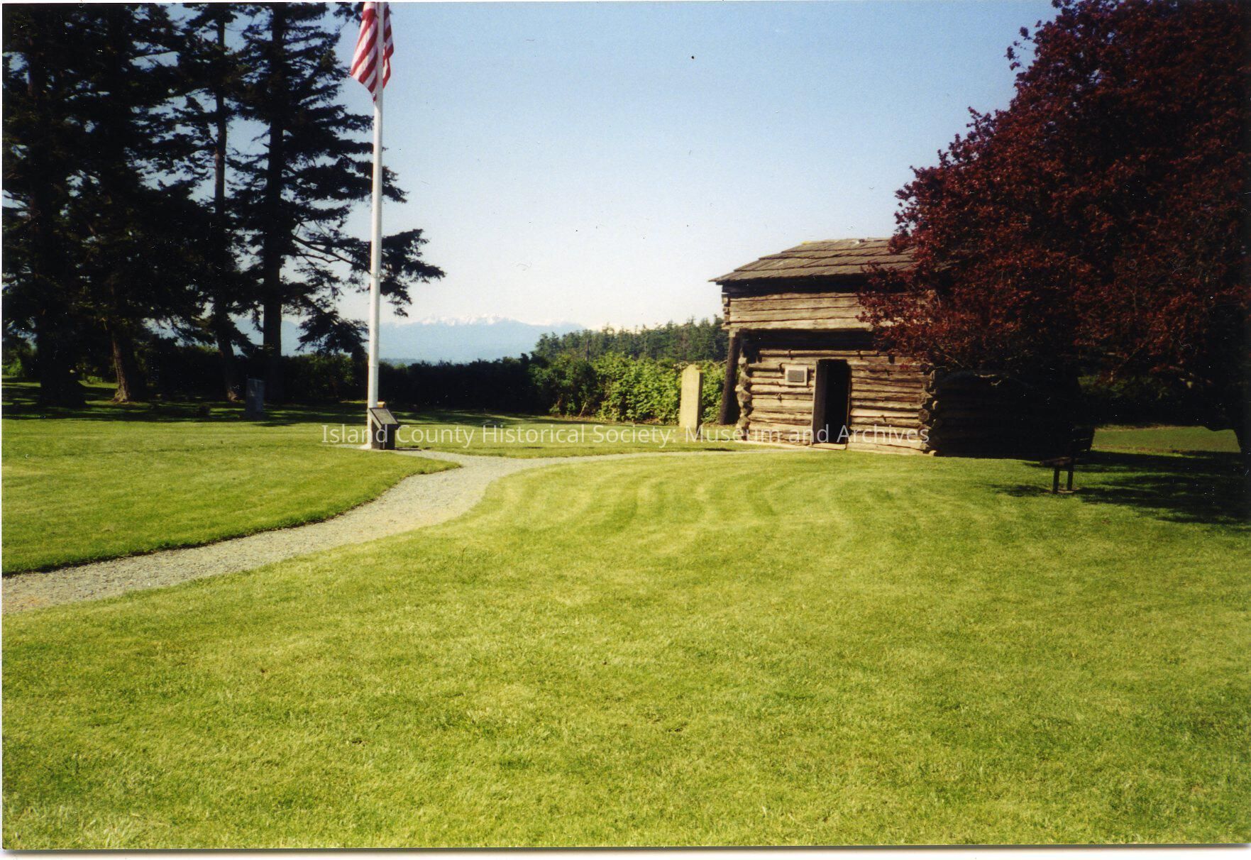Photo of the Ebey blockhouse. A flagpole with flag is on the left with a sign marker. A path leads to the blockhouse. June 2002 is stamped on the back. The photo is from a folder marked Power, Fidelia Newberry.
