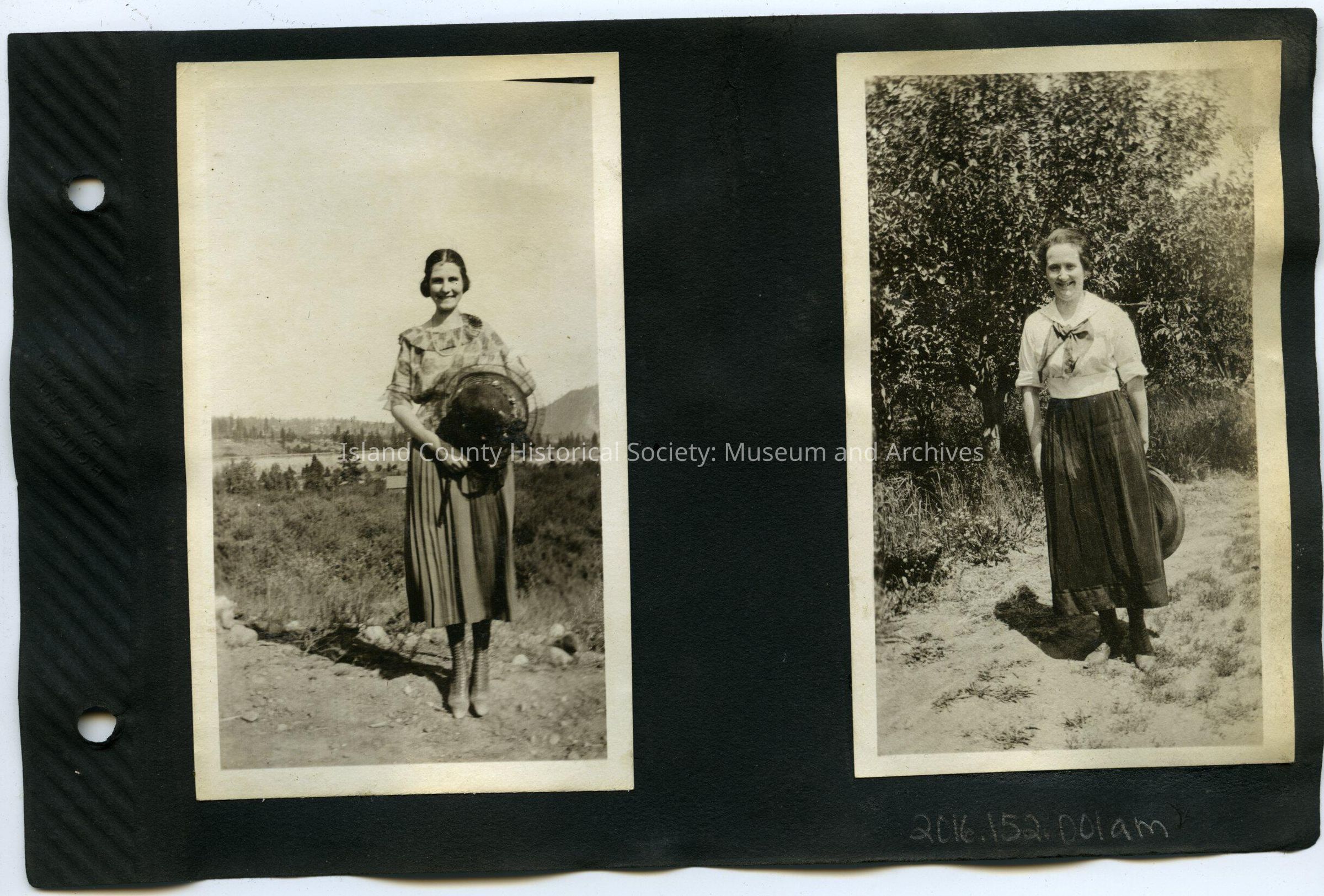 Top Left : A young woman holding a fancy hat; standing on the side of a road, lake or coast and hill behind her. Tall laced boots, pleated skirt, floaty top. 2.75"W x 4.5"H