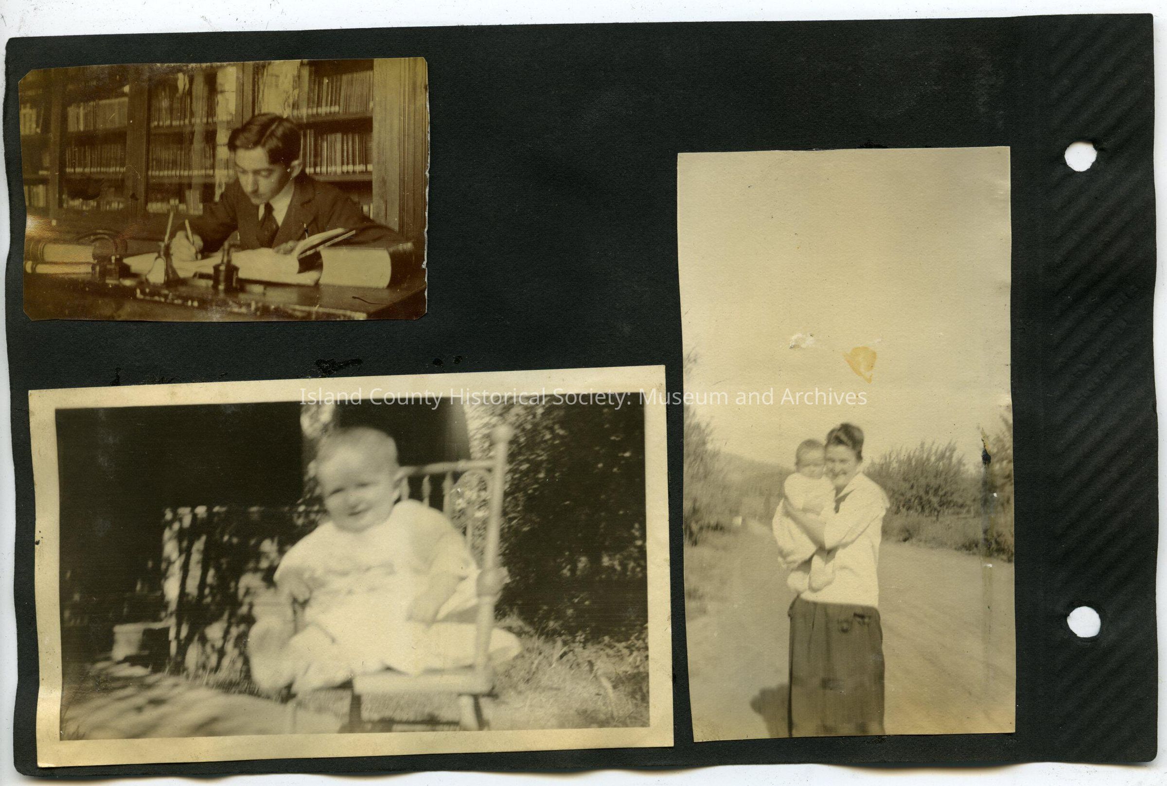 Top Left: A young man wearing a suit, sitting at a desk writing, pen set in front of him, bookcases behind him. 2.75"W X 1.75"H