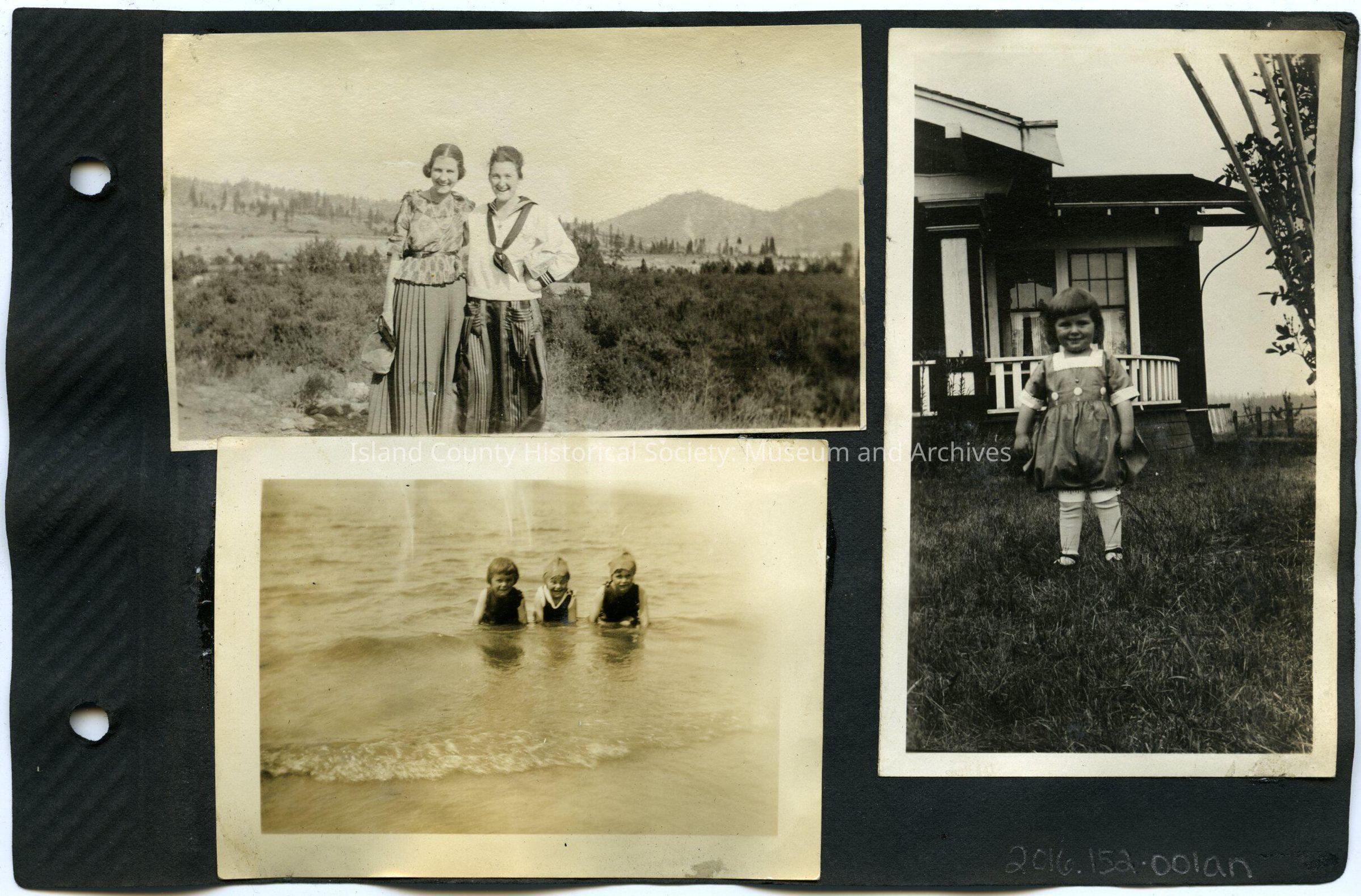 Bottom Left: Three children playing in the water near land. Two have caps or kerchiefs on. 3.75"W X 2.75"H