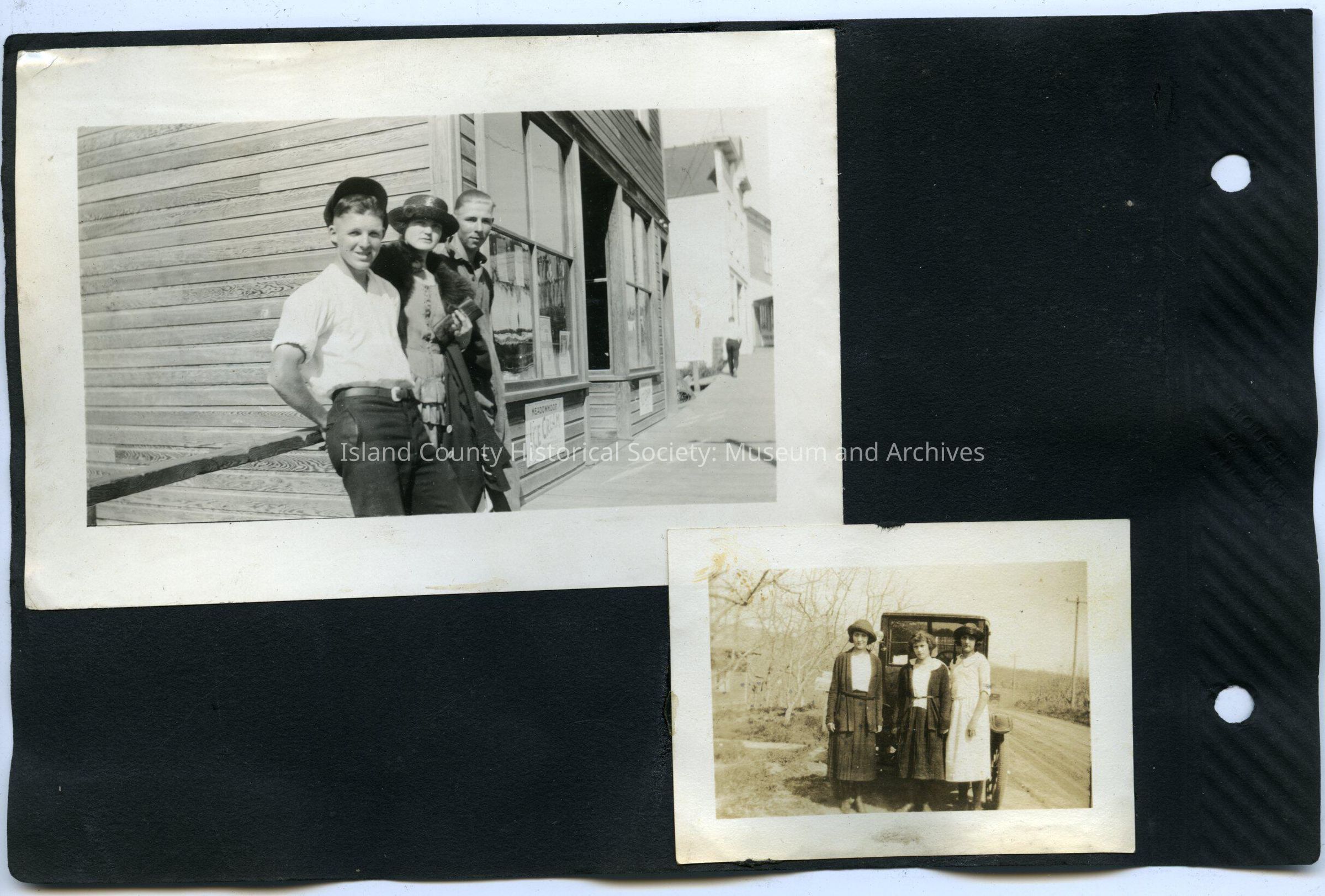 Top Left: Two young men and a woman leaning on a railing beside a store. Wood sidewalk. The sign on the store: Meadowood Ice Cream. One of the young men is wearing a cop, shirt rolled above his elbows and trousers. The woman is wearing a dress, coat with fur trim, hat, holding a clutch purse. 5"W X 3.5"H