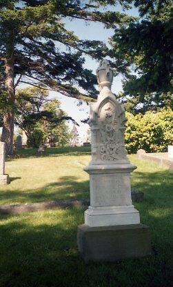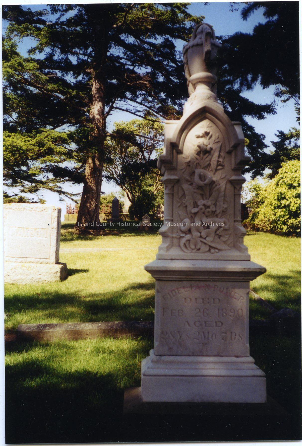 Negative of a tall stone carvved gravemaker for Fidelia N. Power, died Feb. 26, 1890, aged 28 yrs, 2 mo, 7 Ds.
