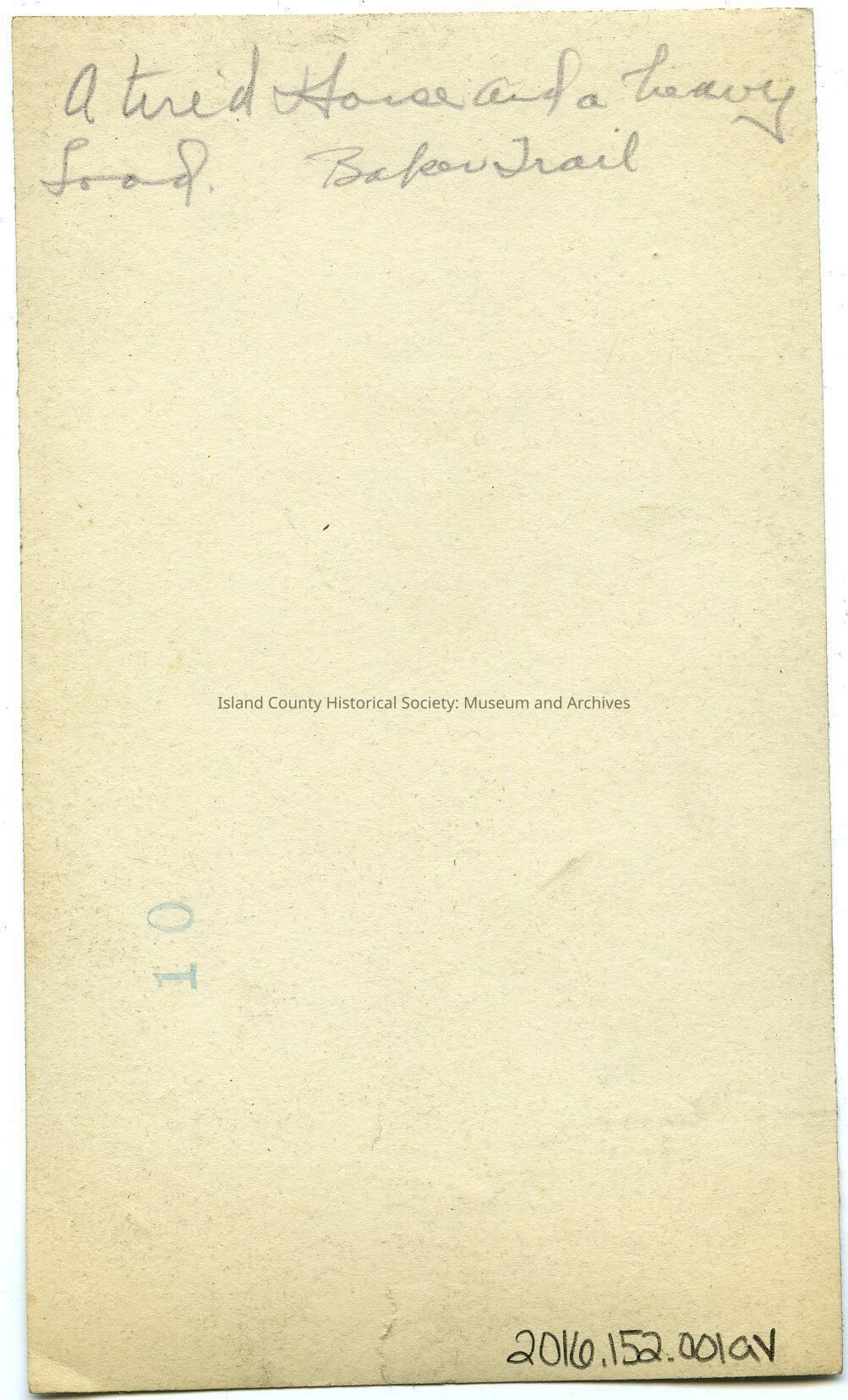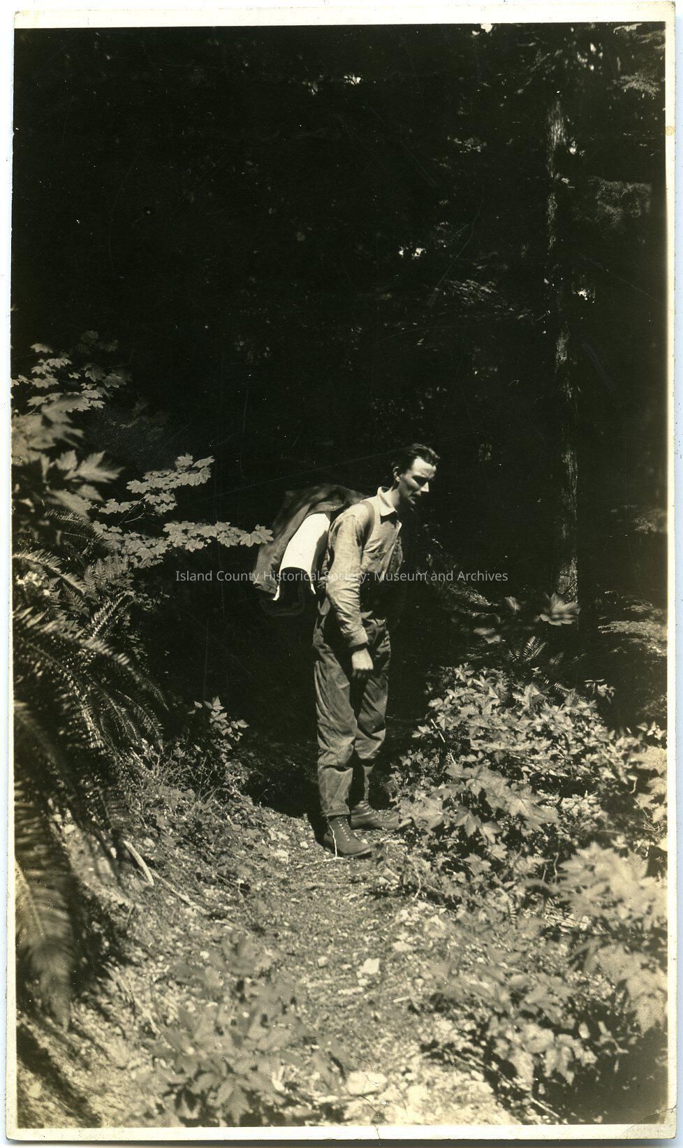 Man with backpack on a wooded trail. Looks very tired. On the back: "A tired House and a heavy load. Bafor Trail"