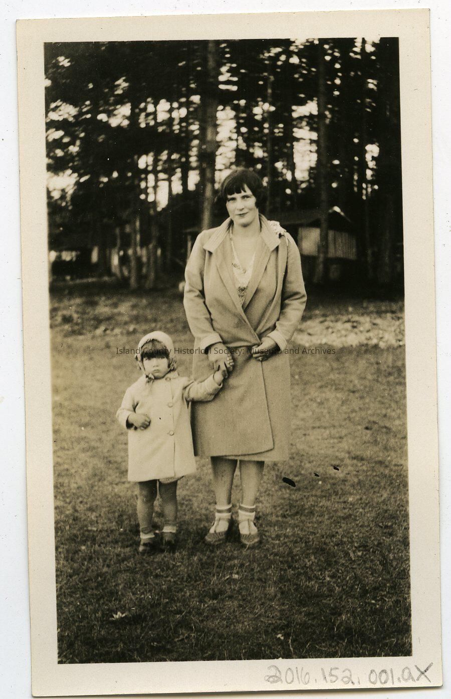 Woman in a coat, anklets, holding little girl's left hand. She is wearing a coat and hat. They are in a cleared area with trees behind them.
