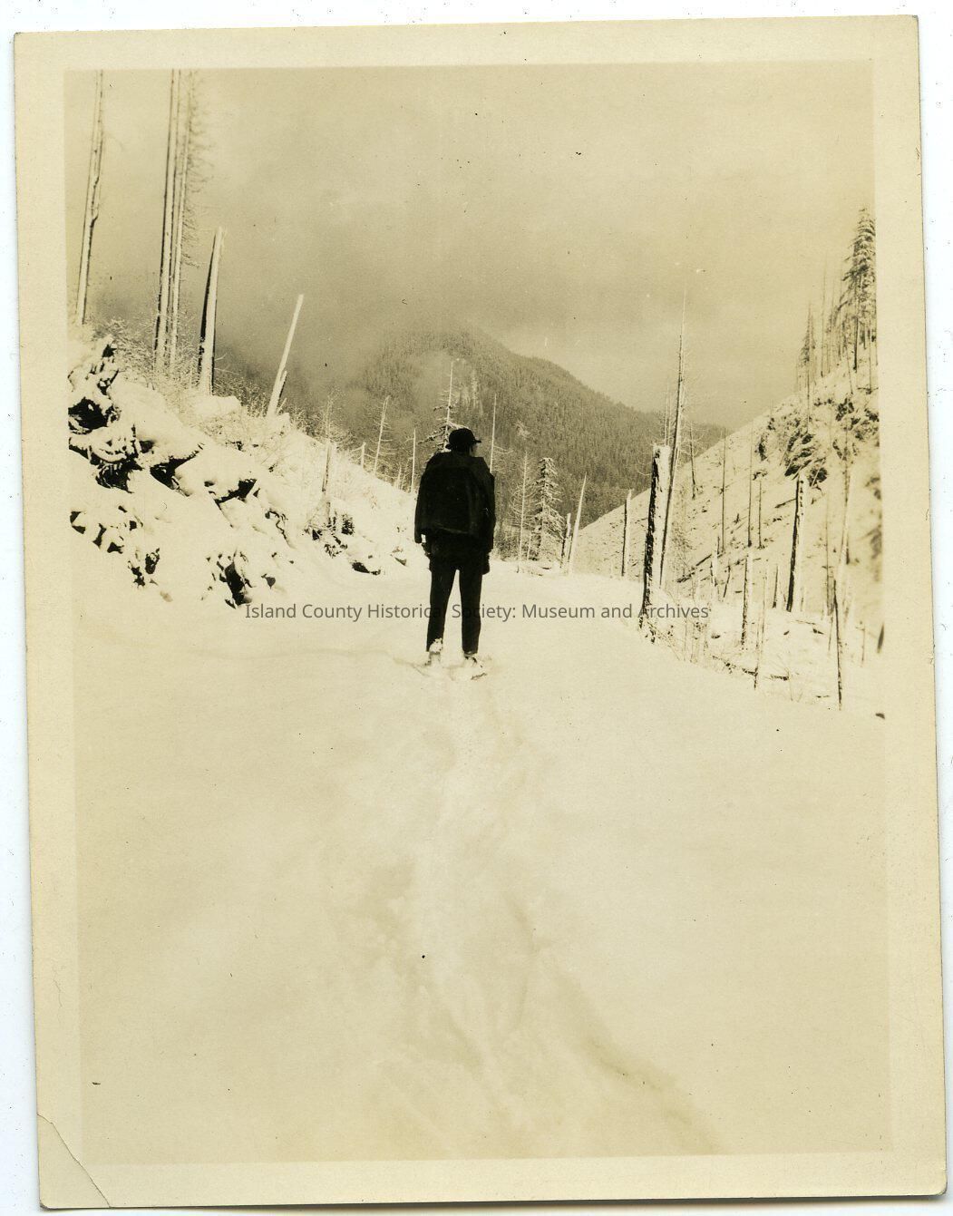 Man in winter jacket and backpack on a snowy path in mountains. A few trees beside the trail. On the back: "Seven miles from Glacier"