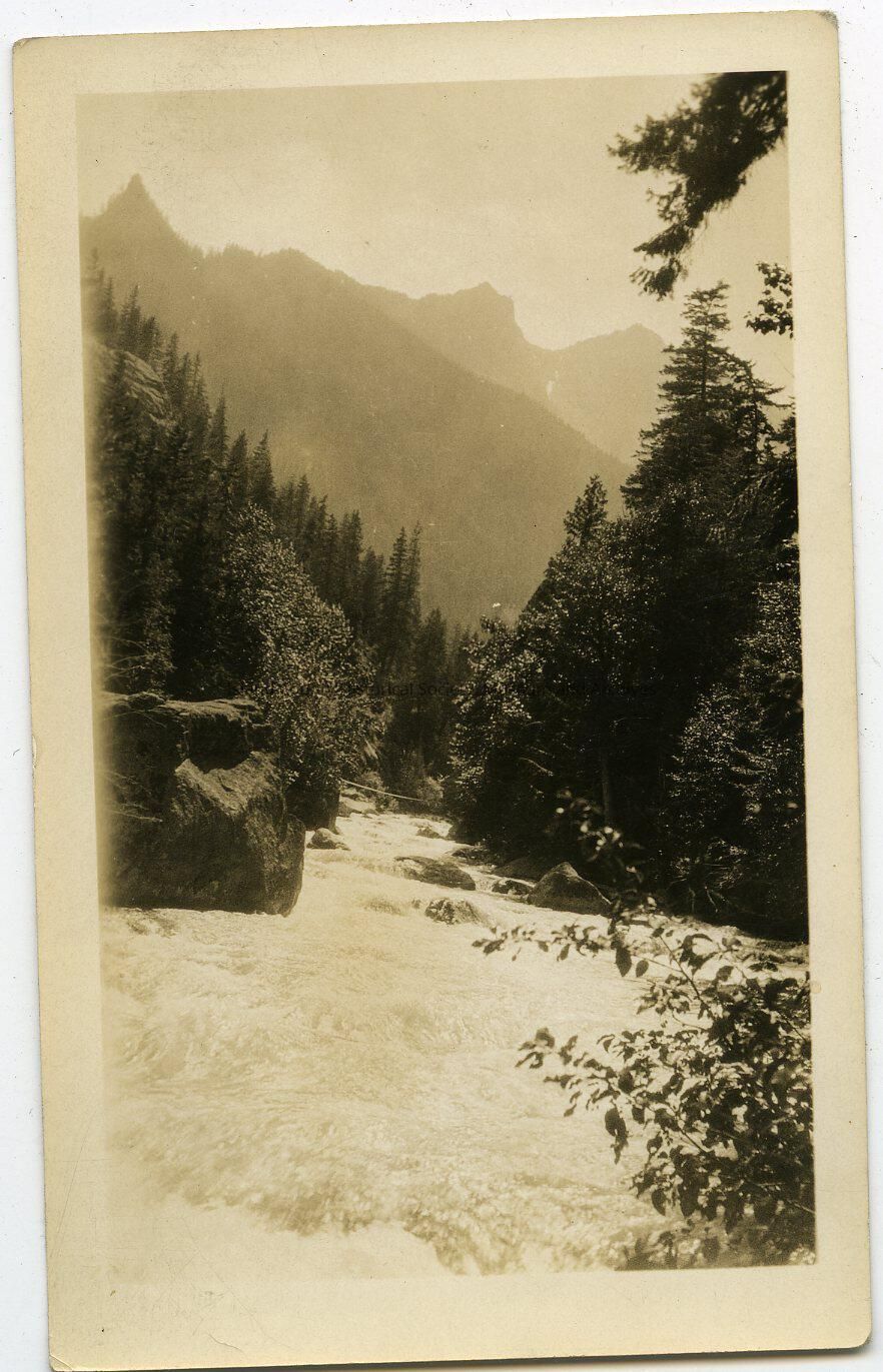 Scenery: mountains, woods, fast running river. Looks like rapids; rocks in the river.
