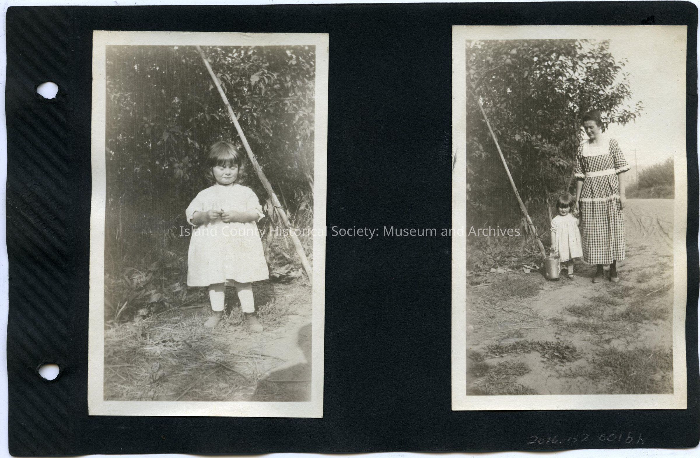Left: Little girl in dress and stockings with her eyes closed. Pole beside her. 2.75"W x 4.5"H