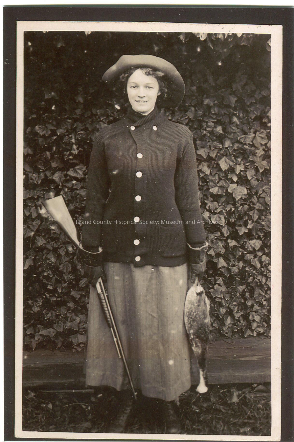 Photo of a young woman standing in front of some bushes holding a shotgun (pointing down) in her right hand and a dead bird in her left hand. She is wearing a long skirt, sweater buttoned up and a hat with the front turned up.