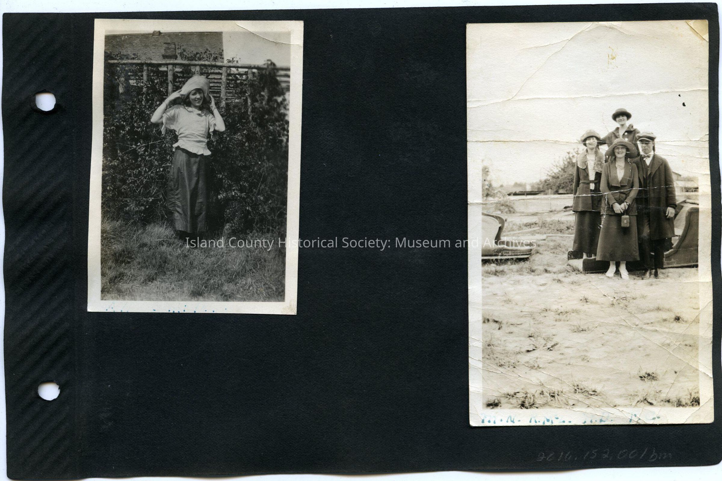 Left: Young woman standing in a garden holding a hat on her head. Caption illegible. 2.25"W x 3.25"H