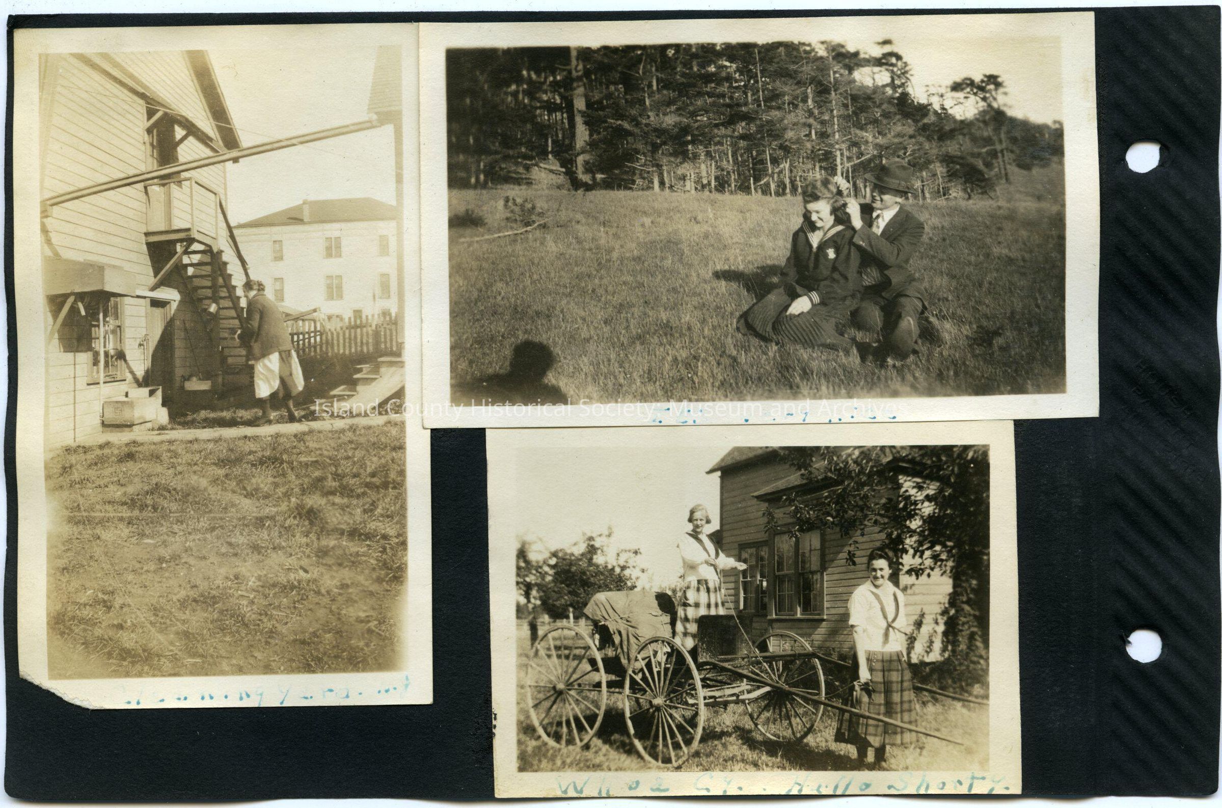 Botton Right: Two young women in plaid skirts. One is standing in a horse carriage holding a rein, the other in between the two pole where a horse would be. Beside a house. Caption: "Whoa CY - Hello shorty" 3.5"W x 2.5"H