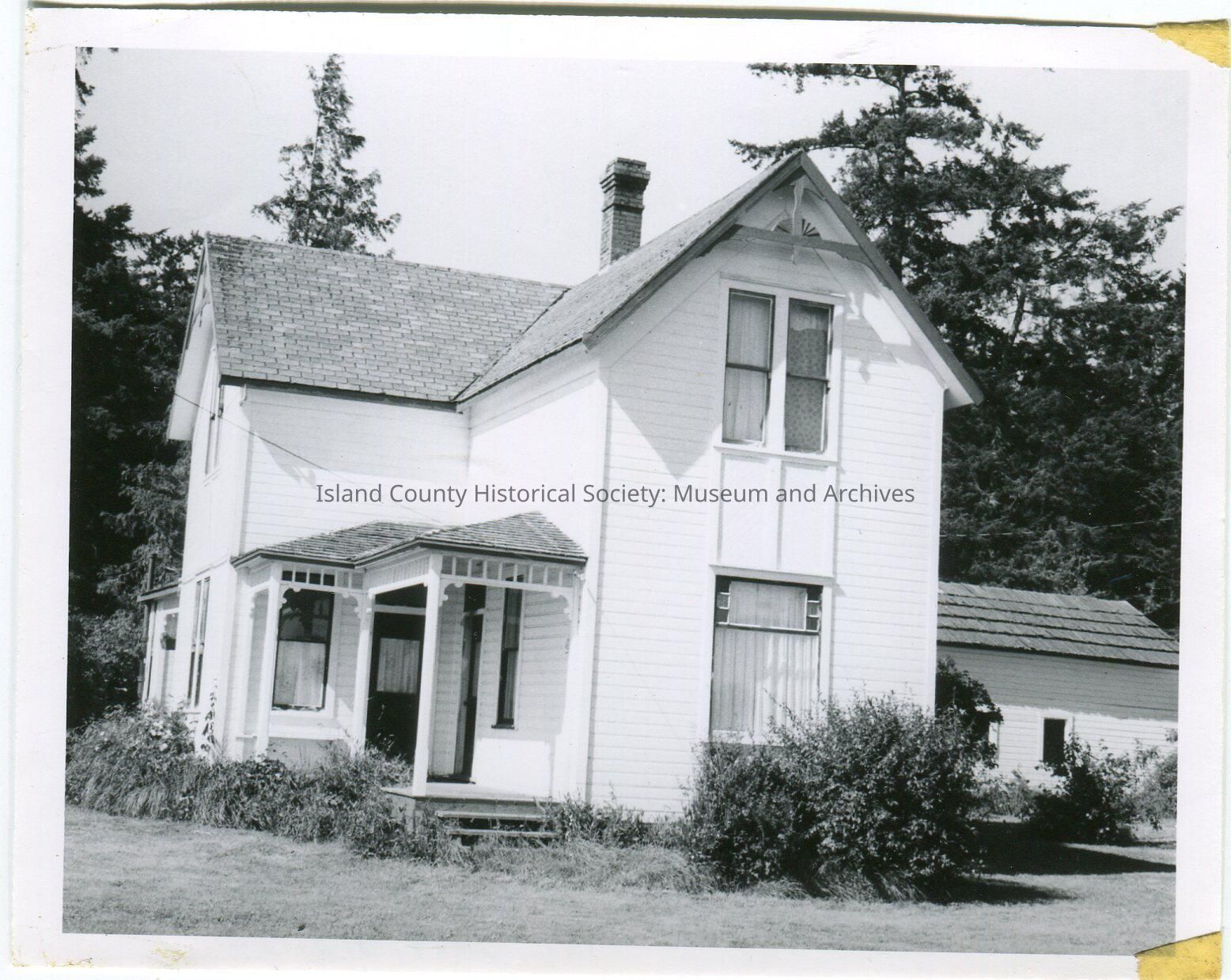 Photo of a house, two story, chimney in the center, narrow front porch, tall narrow windows in the front long section. There is a lower section in the back and a lower attached building on the right. Written on the back: Bert Nuttall c. 1900