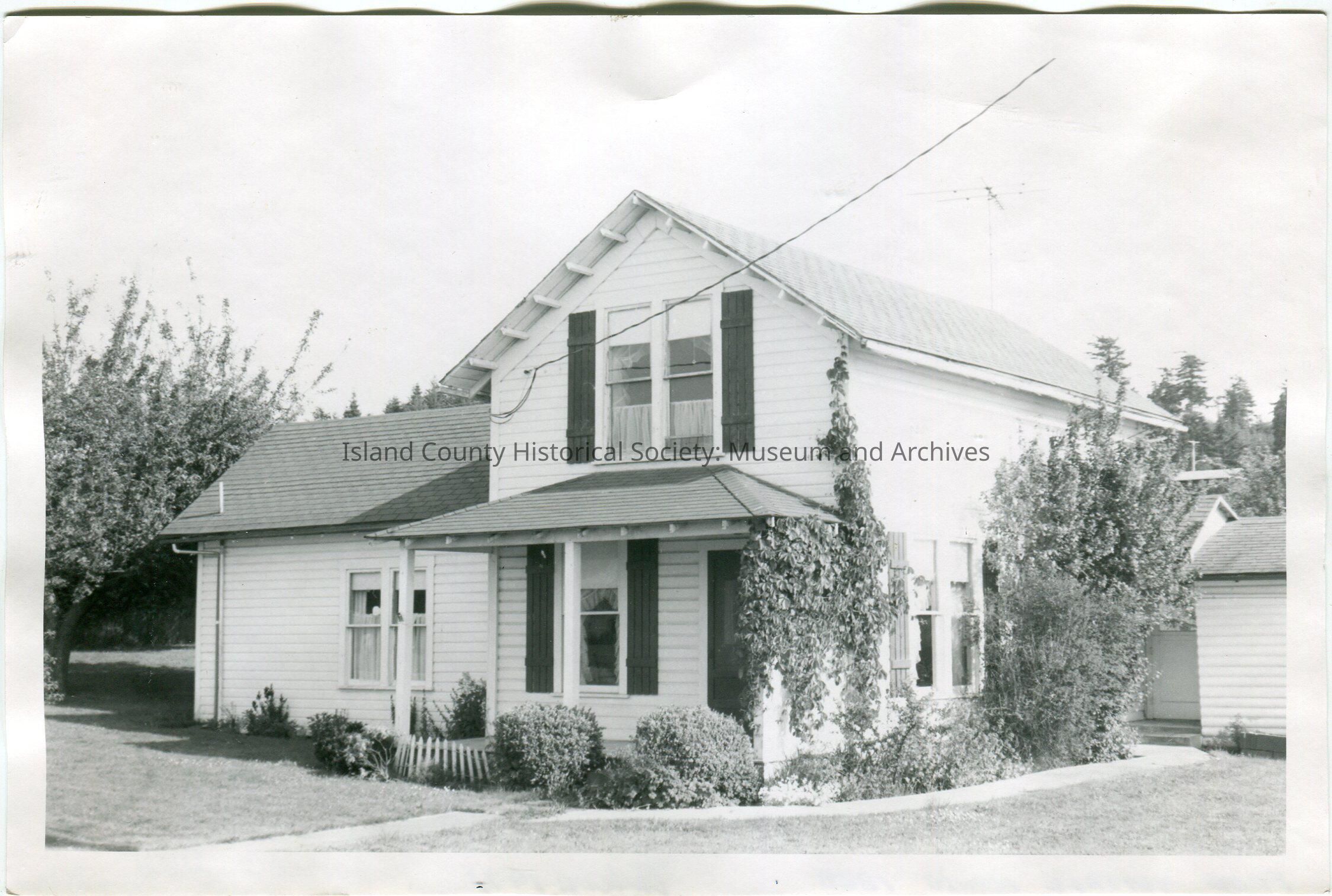 Photo of a house, two story, front porch,windows in the front section. There is a lower section on the left and a lower attached building on the right. A trellis with vine is on the right front corner of the house. An antenna is on the back. Telephone wire is attached to the top floor.