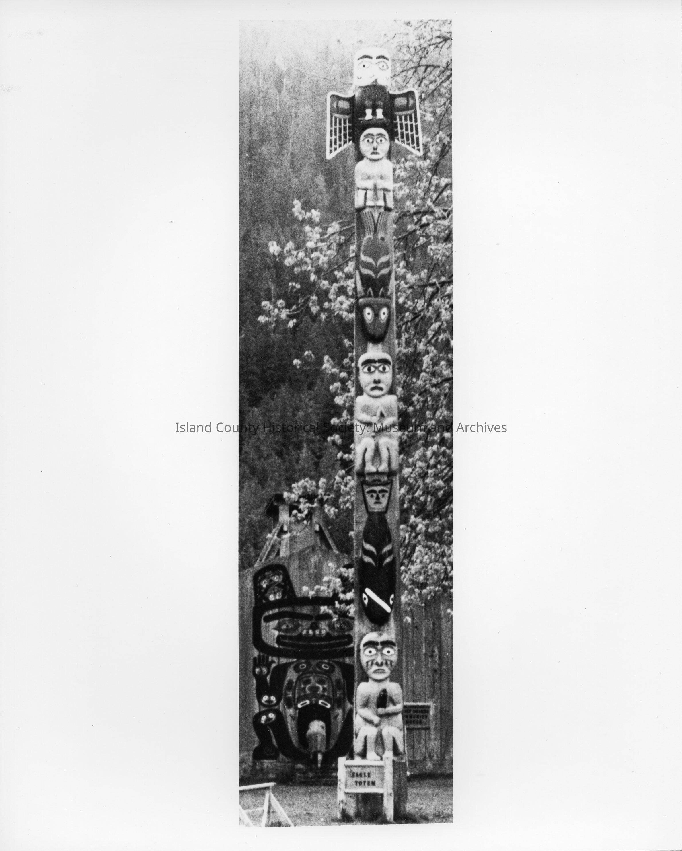 Photo of a totem pole, a sign at the bottom of the pole says, "Eagle Totem." Behind the totem is a tree in blossom.