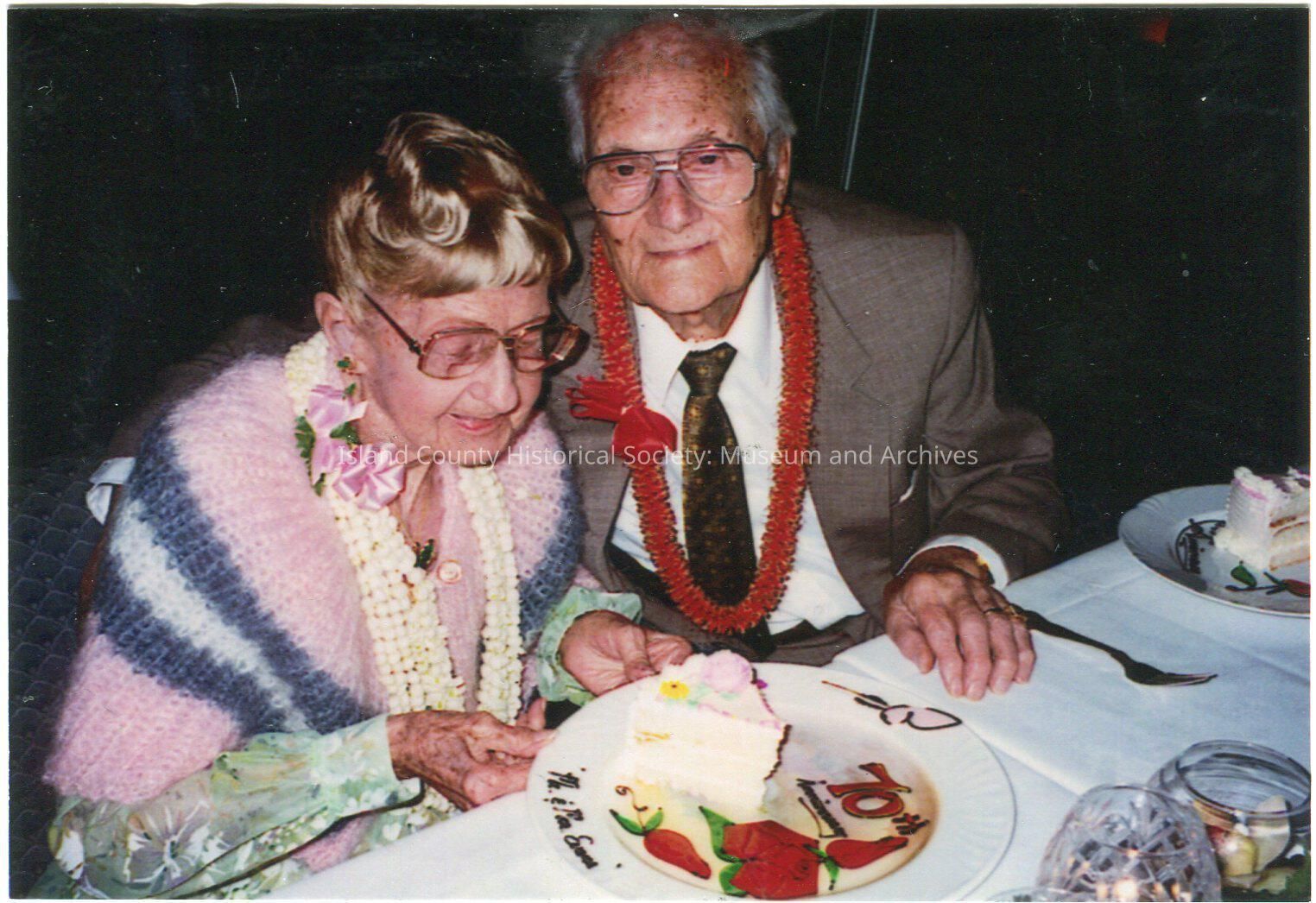 Photo of a couple in a restaurant with a slice of decorated cake on a plate with 70th anniversary, roses and Mr. and Mrs. Evans. The man is wearing a red lei, the woman a white lei. Written on the back: Our 70th wedding anniversary. Charles and Mildred Evans.