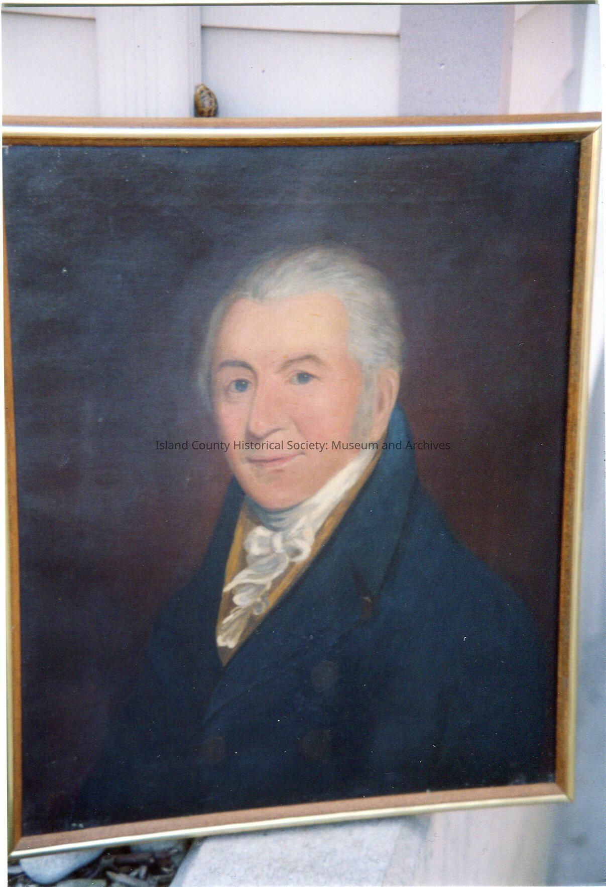 Photo of a painted portrait of a man wearing an early 1800s style coat, cravat.