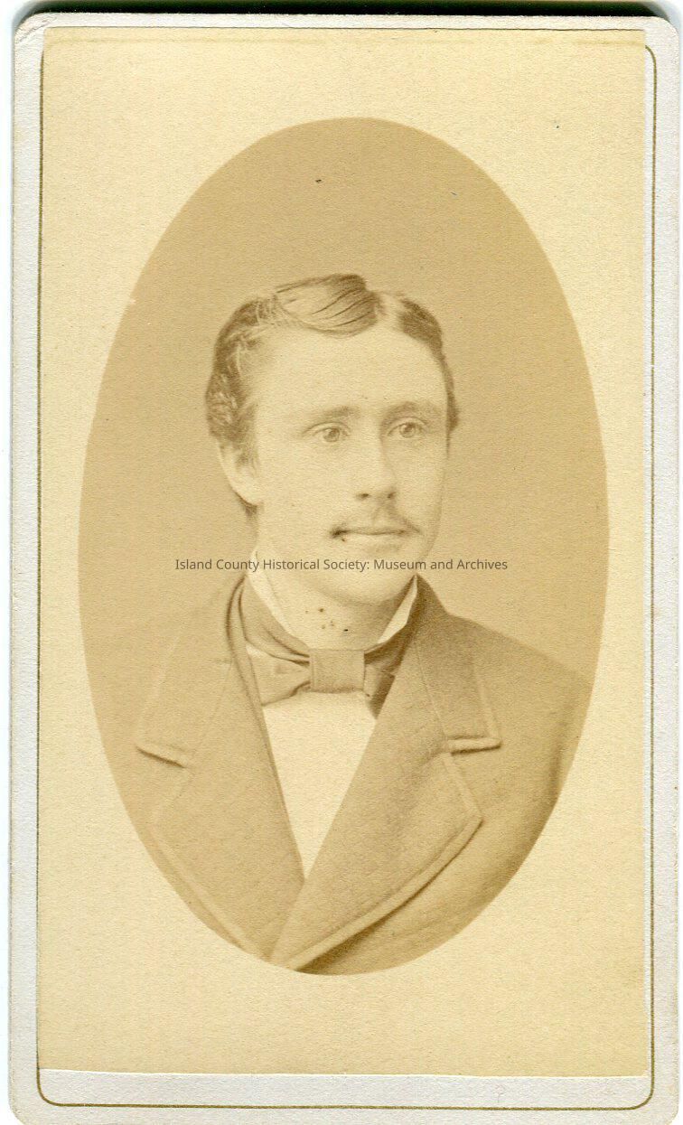 Photo of a man looking slightly to his left, wearing a wide-lapel jacket, bow tie, mustache. From the O'Leary folder