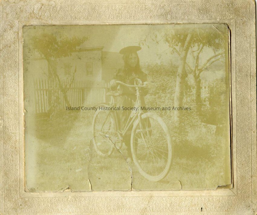 Young girl pushing a bicycle.Likely Libbey Stephanson Yenzer. Back of photo reads: September 1899 11 years old, To Jessie From Beulah Eaton Engle