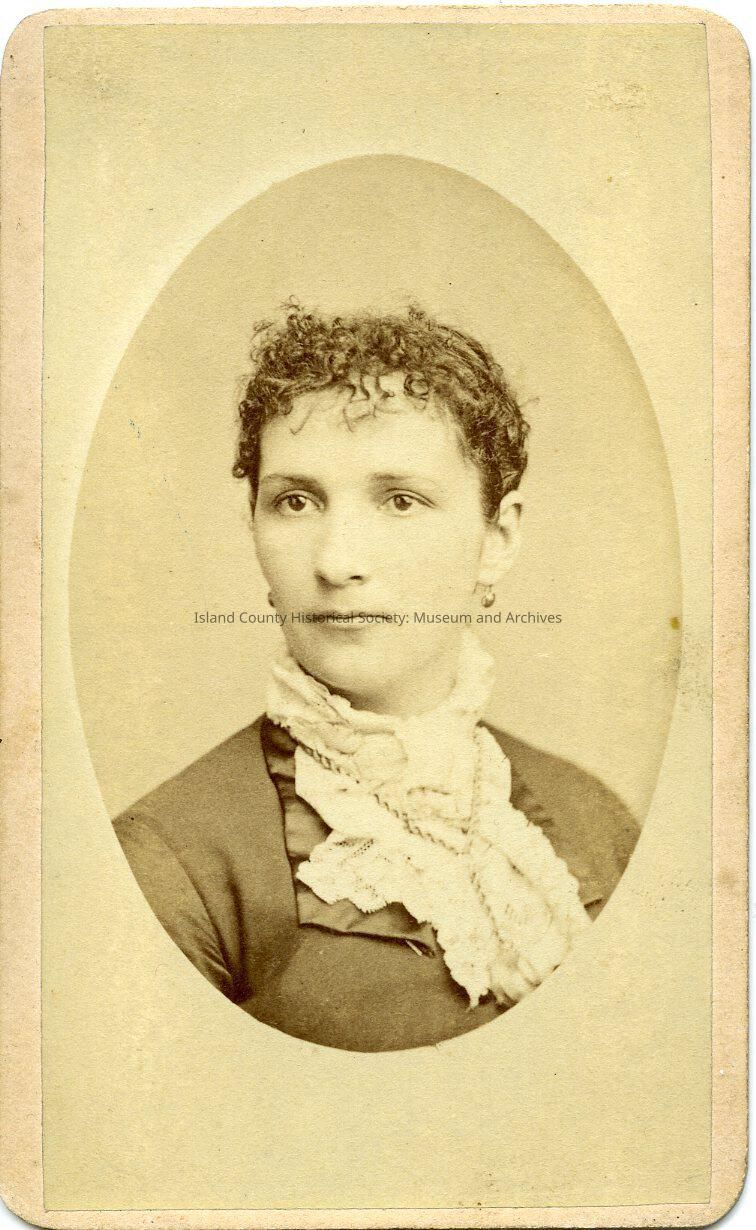 Black & white oval portrait photo of the top half of Keturah Coupe Gillespie as a middle aged woman. She is wearing a dress with a white, frilly ascot. Her dark hair is curly & pulled back. Photo is mounted in a cardboard frame. No date.