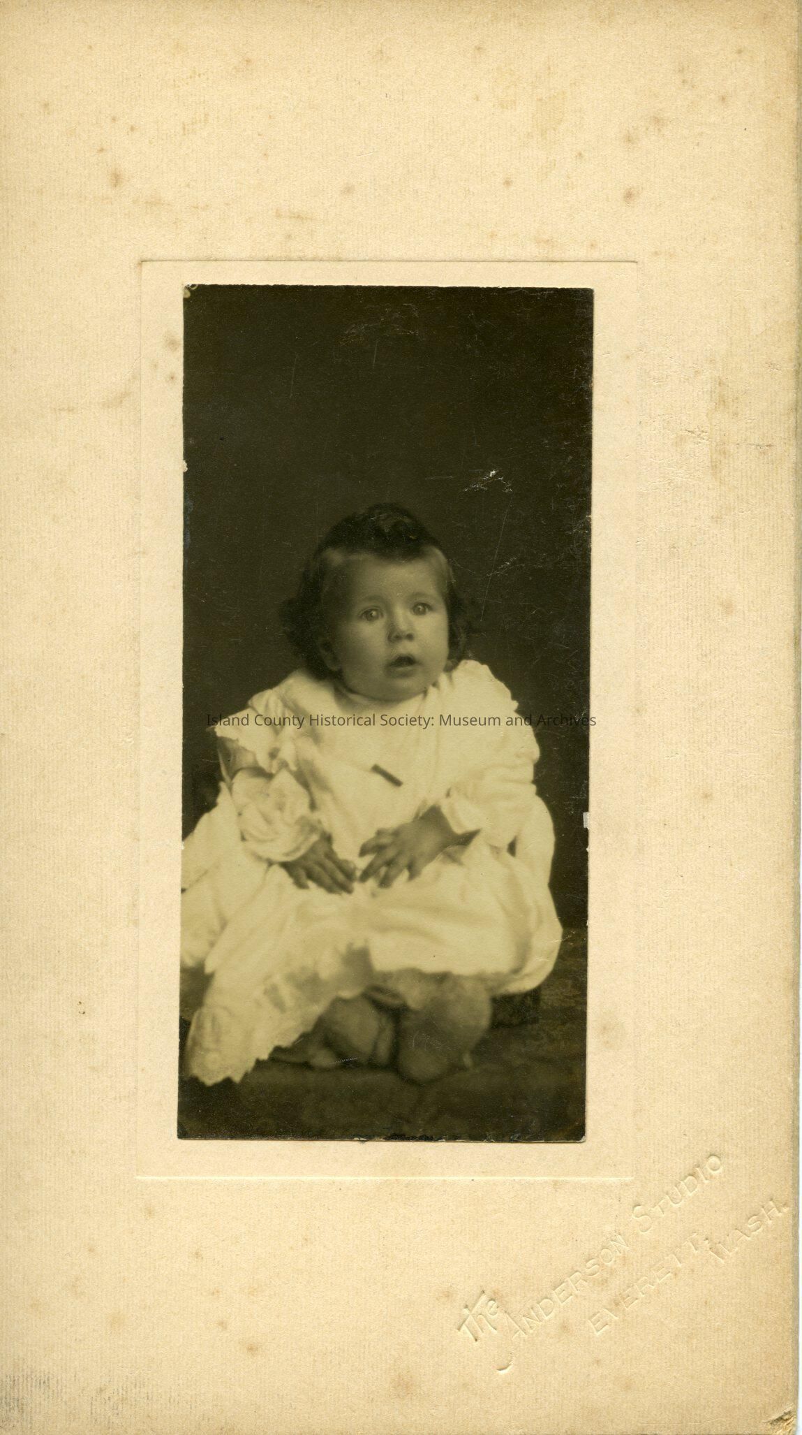 Baby girl sitting for the camera in a white dress.Back of photo reads: Loucile Dickenson