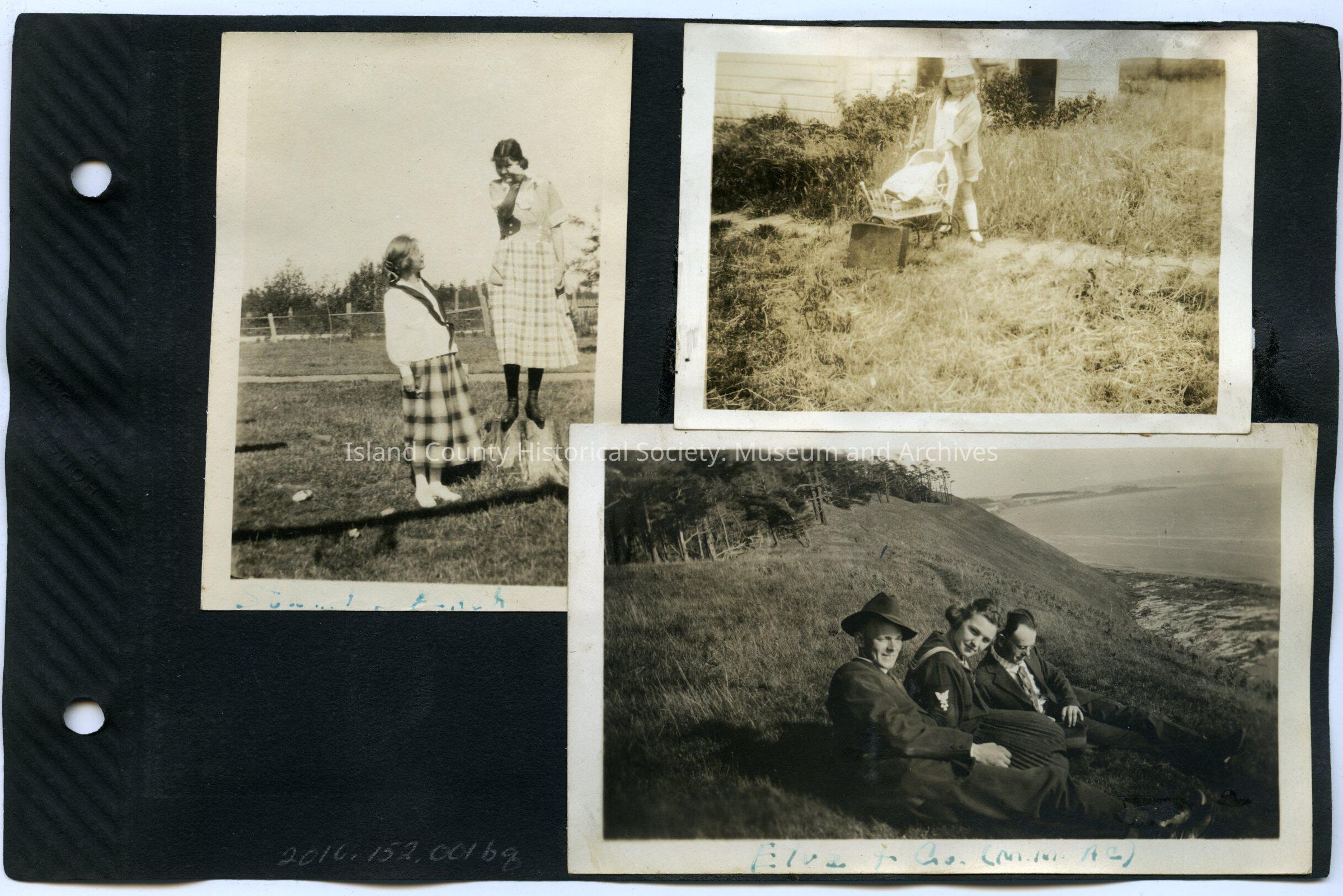Right top: A young girl dressed in white with a white hat standing in front of dolls baby carriage. She standing in a field of weeds. 3.5 x 2.5"