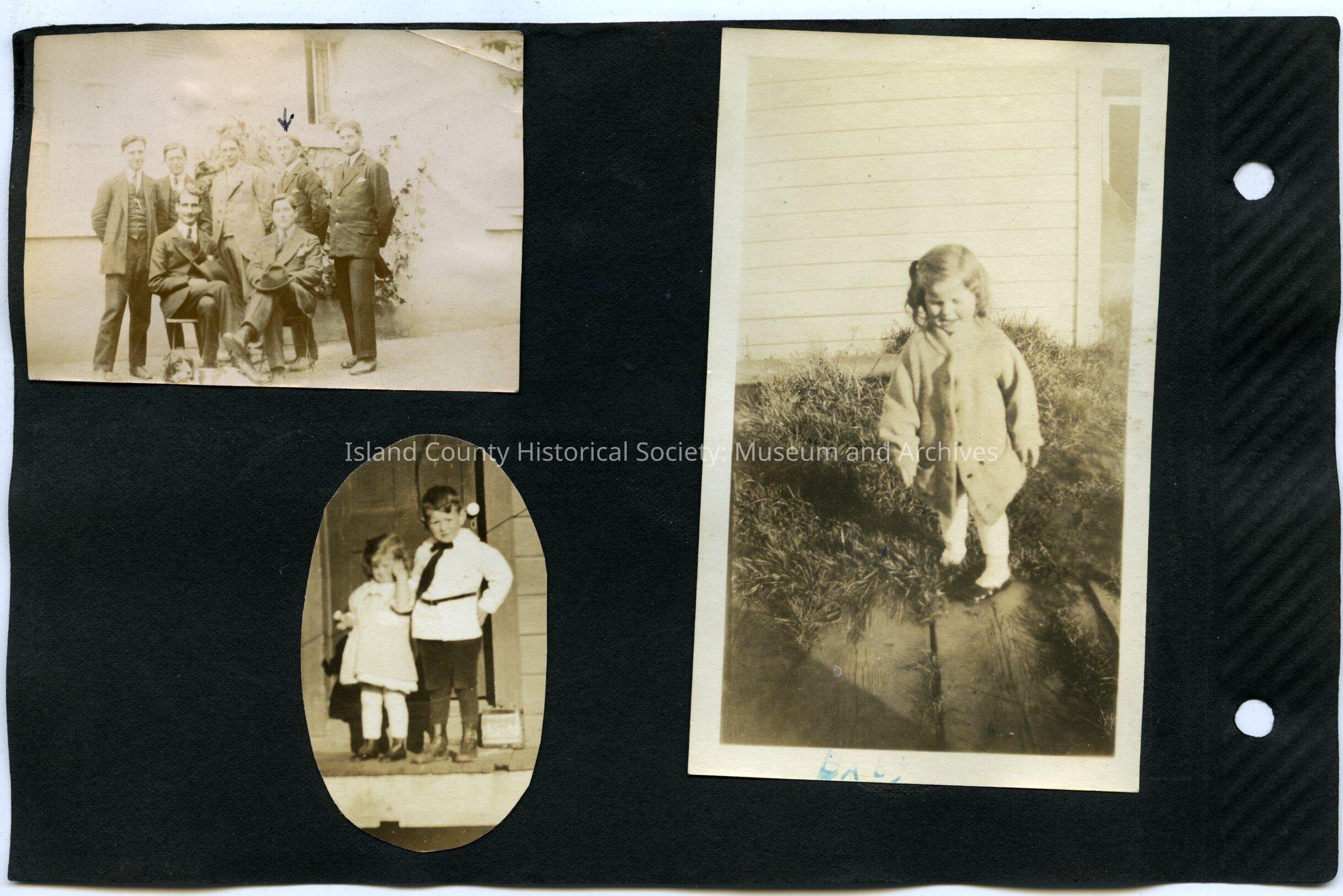 Bottom Left: Two young children standing in front of a door. The young girl is wearing a white dress and white stockings. The young man is wearing a white shirt and dark pants. He is also wearing a tie. 1.5" x 2.5"