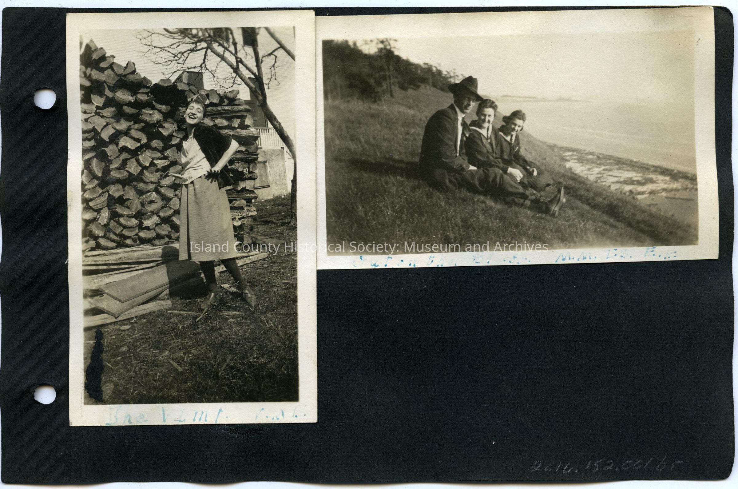Right: A man and two young girls sitting on a hill with water in front of them and a row of trees in the background. The man is wearing a dark suit and dark hat, while both girls are wearing sailor suits. 4.5" x 2.75"