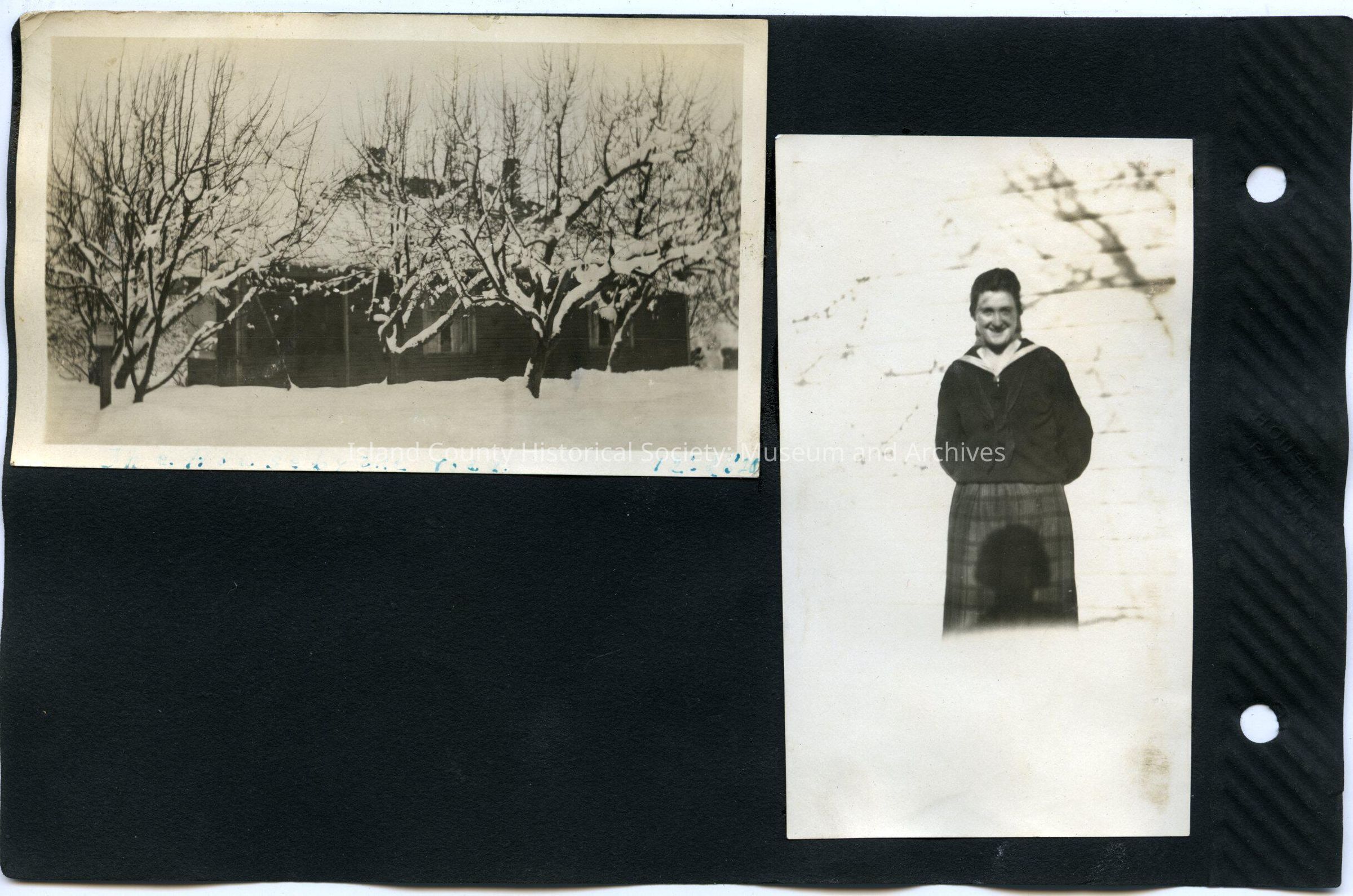 Right: A woman standing in a snow bank wearing a dark sailor suit and a dark plaid skirt. 2.75" x 4.5"Made/Created