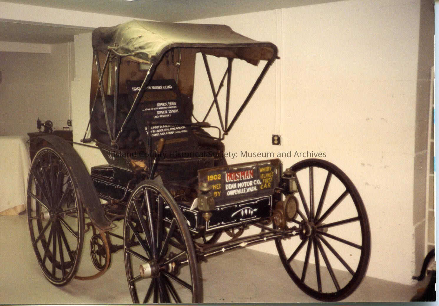 A color photo of the Holsman car in the ICHS museum. There is a sewing machine behind the car. It is probably in the old museum.