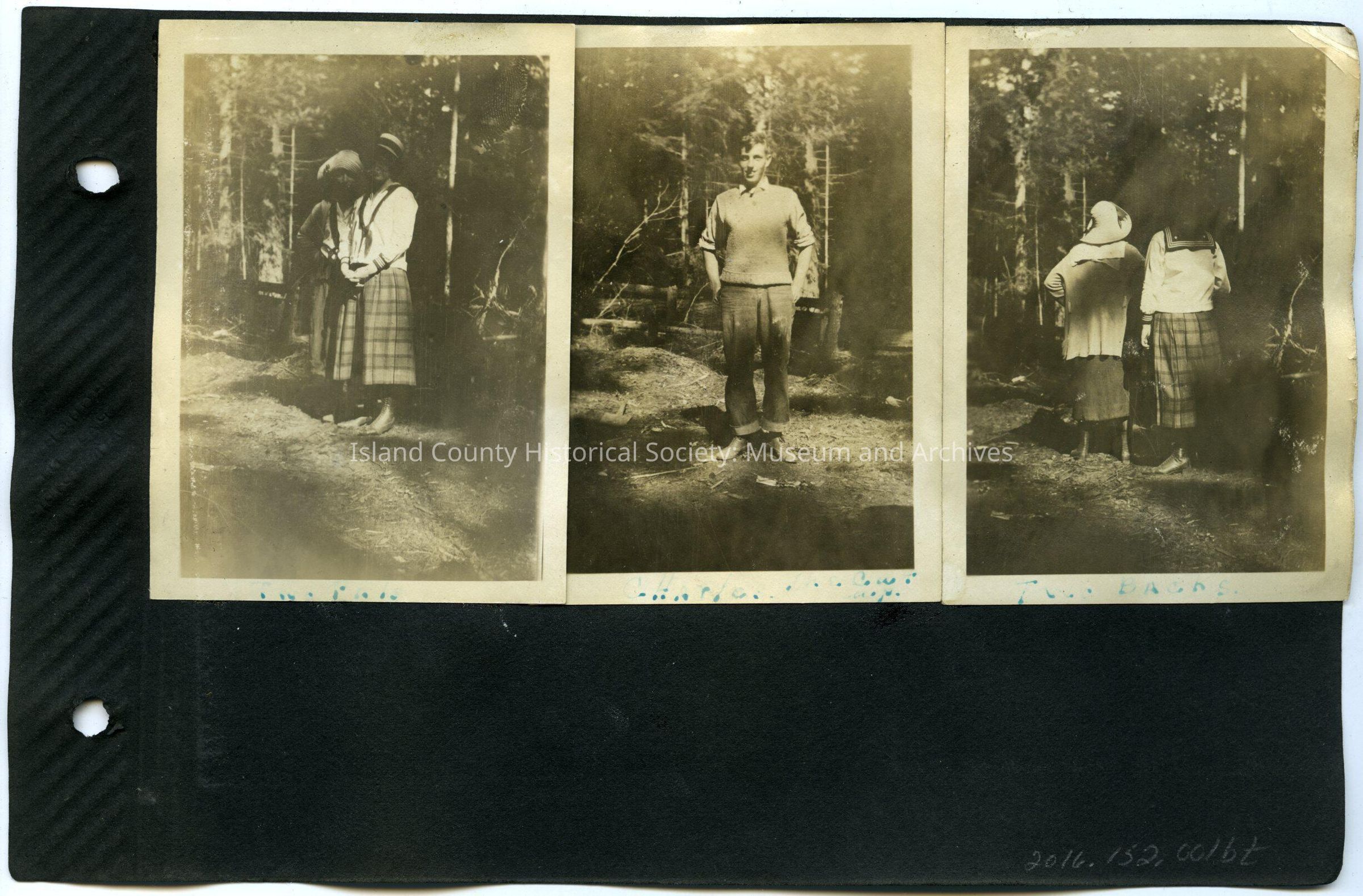 Right: Two women standing with their backs to the camera in a grove of trees. See left for decription. 2.5" x 3.5"