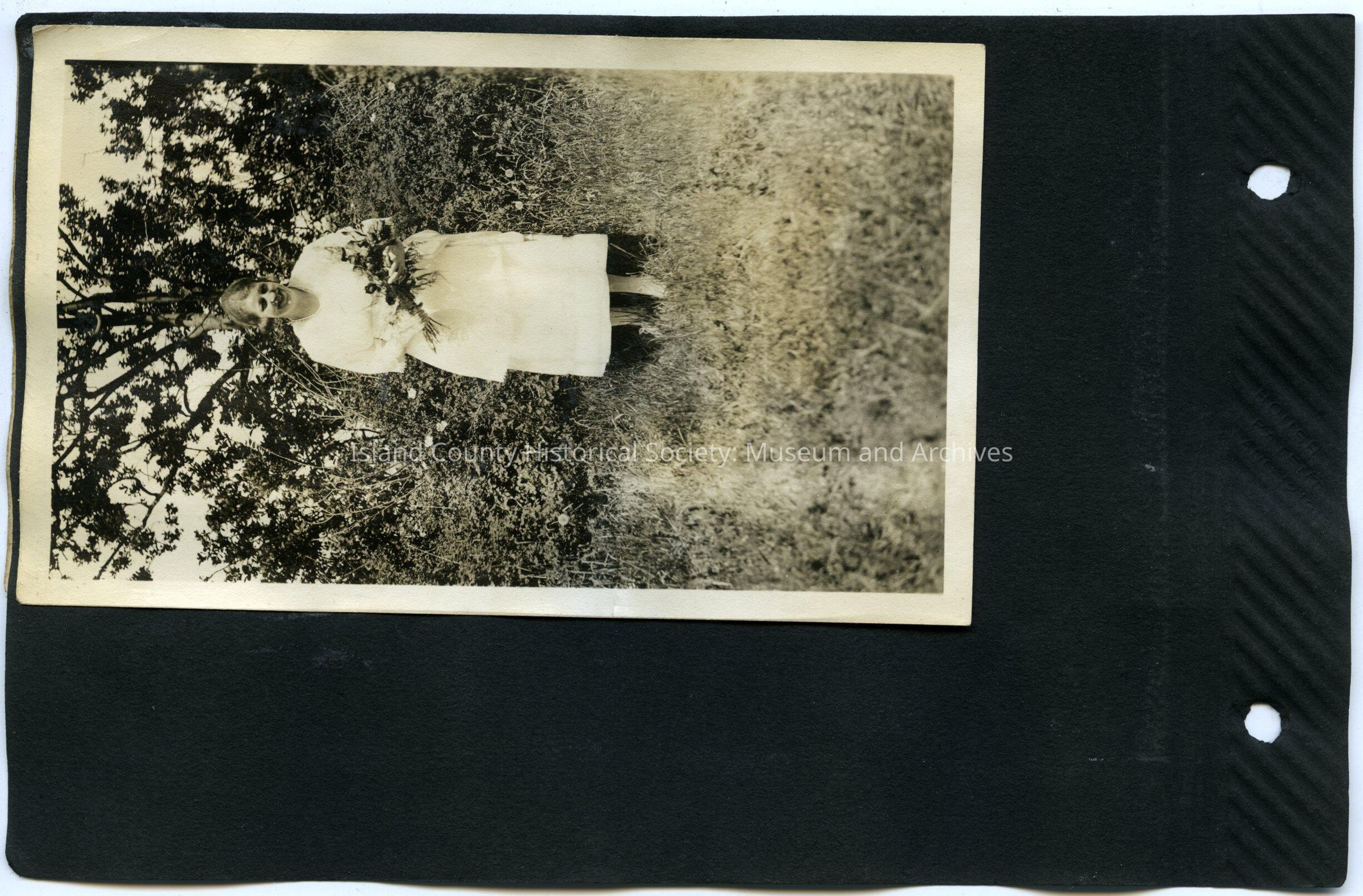 Back: A woman standing in a field hold a bouquet of flowers. She is dressed all in white. Behind her is a large tree and some bushes. 3.5" x 5.5"