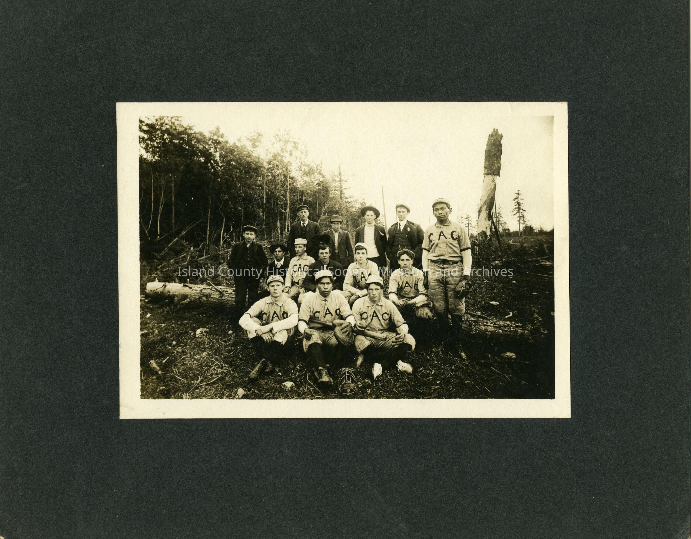 Group photo of several boys , about half are wearing baseball uniforms. Back row 4th from left is Elwell Libbey, 5th from left is Howard Libbey. Cousins. Howard, son of Jim; Elwell son of George - Jim and George are brothers.