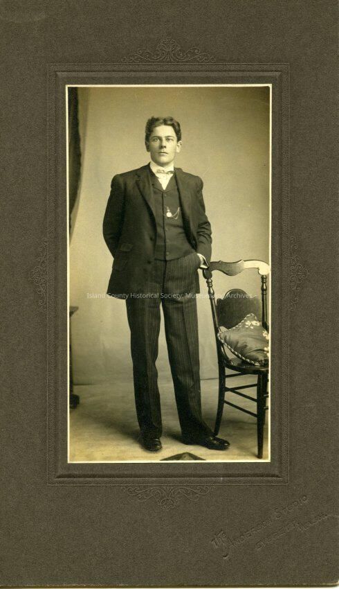 Portrait of possibly Lauren Gillispie in a suit standing next to a chair. Friend of Clara B. Libbey.