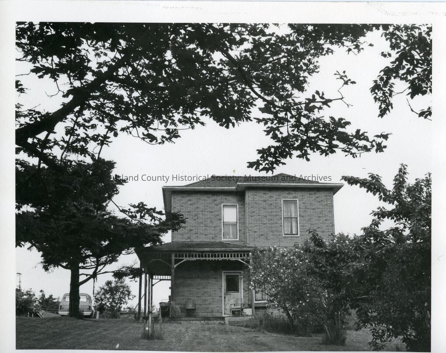 A large brick home surrounded by a well maintained lawn. The home was built in 1893 and was owned by Luther Clark the photo was taken in 1971.